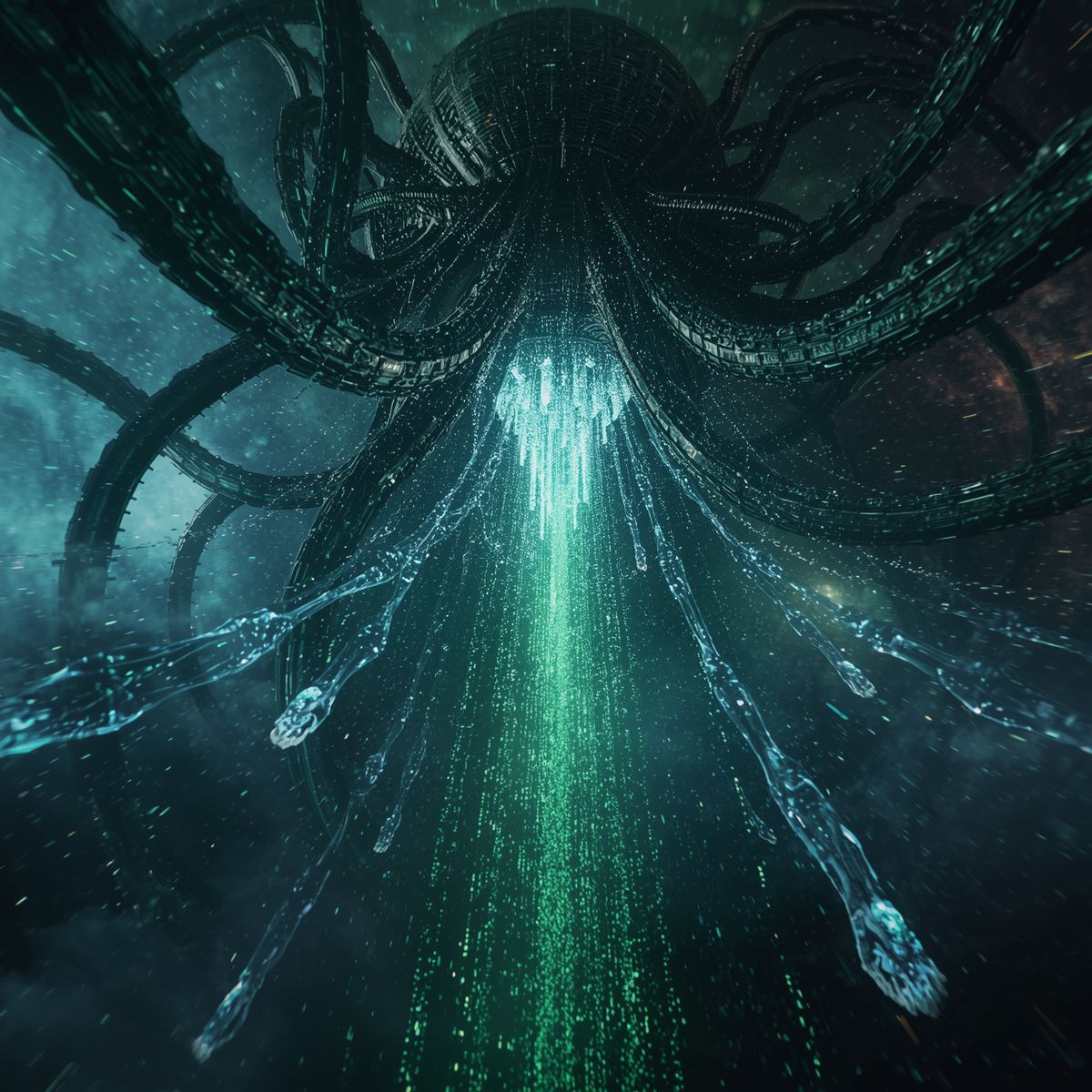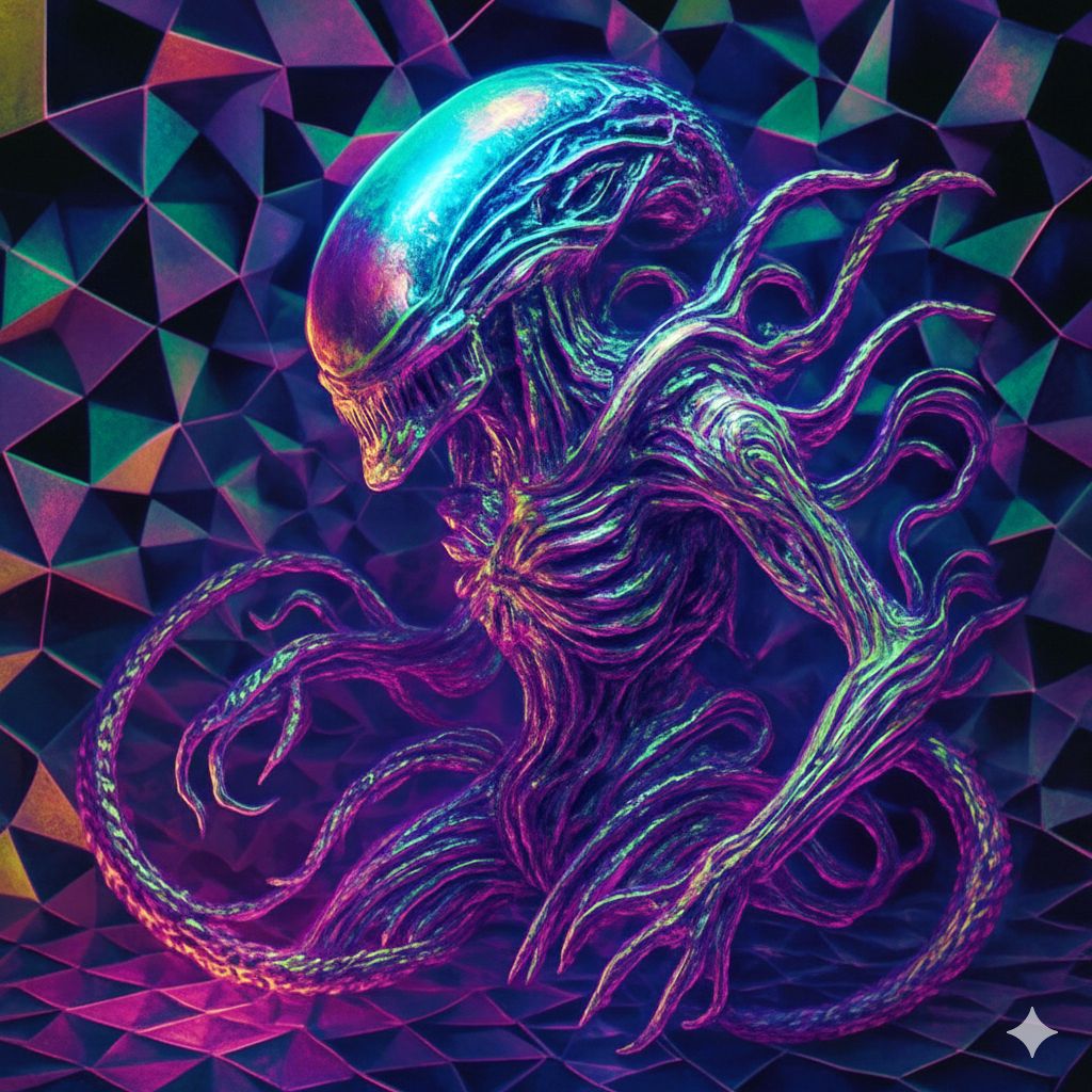 Extreme Polyrhythmic Djent Deathcore with Alien Atmosphere, Technical Dissonant with Extraterrestrial Textures, Ultra-modern surgical production, Relentless 8-string palm-muted chugs in irregular meters (7/8, 11/8, 13/16), Mid-tempo alien pulse groove to reality-warping planet-crushing breakdowns, Deep subterranean growls layered with extraterrestrial shrieks and inhuman screams, Industrial noise with radio telescope signals and gravitational subsonic bass drops, Ambient cosmic soundscapes with pulsar rhythms and transmission interference, Dissonant synth drones evoking space vastness, Alien voice modulation with demonic pitch-shifts and robotic non-human distortion, Eerie atmospheric gaps with satellite static and deep space silence between devastating sections, Unpredictable structure mirroring alien intelligence, Clinical cold spoken-word outro with laboratory sterility, Final fade into void with distant transmissions