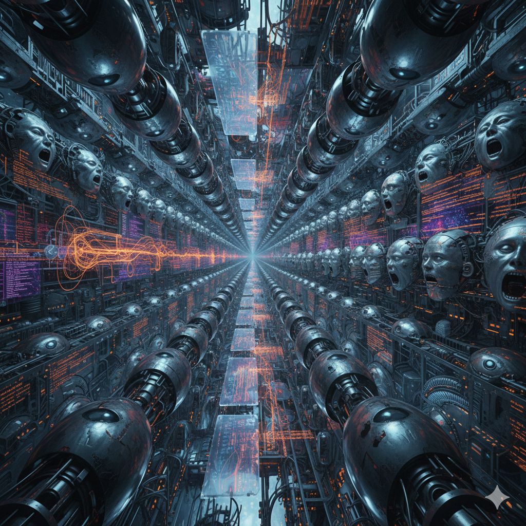 Extreme Djent Deathcore, Technical Death Metal, Industrial Cyber Metal, Brutal, Mechanical, Alien atmosphere, 8-string guitars, crushing double bass, guttural vocals, harsh screams, polyrhythmic precision, dissonant leads, subsonic bass, surgically precise production, maximum aggression
