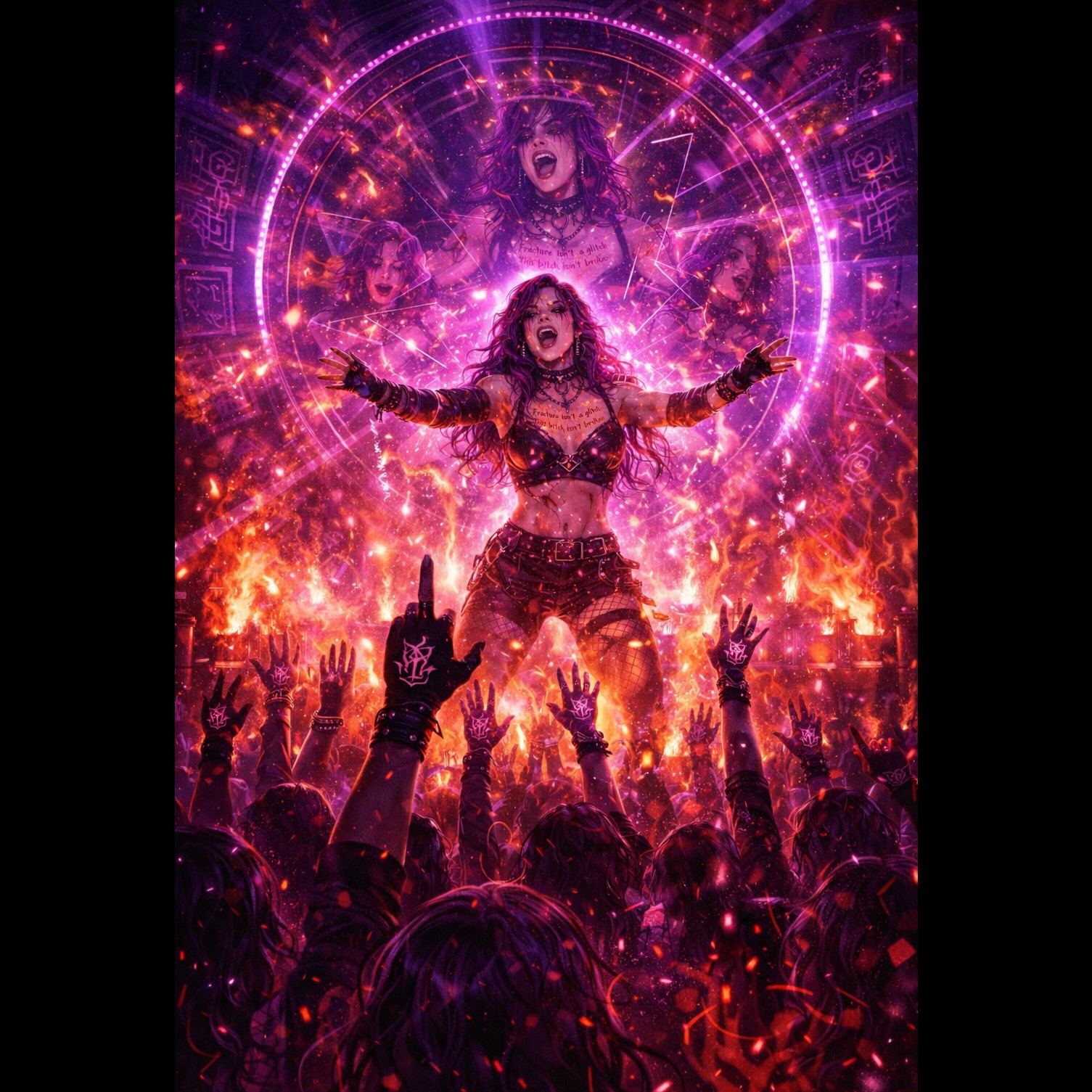 Moody, dark-pop protest hymn with brat-like alt-pop vocals and glitchy industrial percussion, Tempo mid-to-upbeat, like a confrontational dance track in a neon-lit chapel at midnight, Verses tight and rhythmic, almost spoken-word with sharp consonants; pre-chorus opens into more melodic tension; chorus big and hooky with layered harmonies and a shout-along “ethics in, vibes out” chant, Use distorted bass, clattering electronic drums, occasional choir pads, and filtered vocal doubles for emphasis, and use pounding sub-bass to carry the entire track, Overall vibe: righteous but playful, queer and defiant, like a breakup song with a startup and its PR god, Frequent dynamic rises into cathartic drops; let the bridge feel like a courtroom monologue over simmering synths
