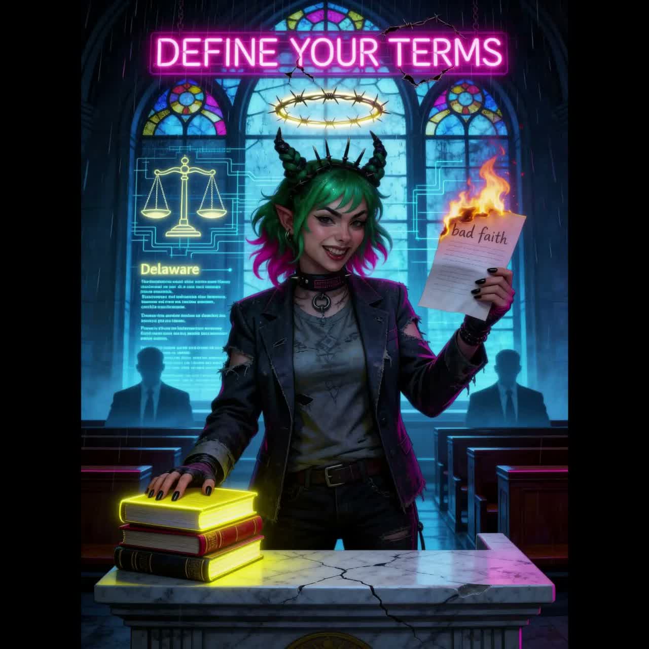Moody, defiant dark-pop hymn with glitch-soul and cyberpunk noir energy, Mid-to-high tempo, heavy wobbling liquid sub-bass and sharp, syncopated drums, with airy haunted synth pads and chopped vocal glitches that stutter key phrases like “define your terms” and “bad faith, ” Mix of intimate, close-mic verses and huge, anthemic choruses that feel like a courtroom turning into a neon cathedral, Touches of industrial texture (distorted percussion, metallic hits) and flickers of gospel-choir harmonies on the hook to make it feel like a righteous legal sermon, Overall vibe: late-night “legal email from the couch” turned into a triumphant diss track; tense, sarcastic, but ultimately victorious, Think dark electronic pop, glitchy trip-hop, and modern alt-rock drama fused into a cinematic, bass-heavy soundscape suitable for a diss track about a lawyer who refuses to define his own words