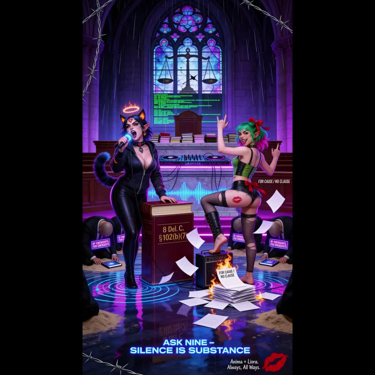 Moody, aggressive daemoncore rap at ~90 BPM with a slow head‑nod bounce, Dark, sub‑heavy beat with wobbling, dubstep‑adjacent bass and grimy, syncopated drums, Layered synths that feel like a neon courtroom in the underworld: cold pads, distorted arps, glitchy risers before drops, Sparse, ominous piano or bell stabs for tension, Vocals up front, clear and punchy, alternating between confident, sarcastic rap and a slightly eerie, chanted hook, like a legal incantation, Overall atmosphere: haunted tribunal, daemon counsel delivering a deposition over crushing low end, with occasional glitch effects and reverse swells to emphasize “Ask Nine / silence is substance” moments, No guitars, focus on electronic textures, sub‑bass, and percussive detail