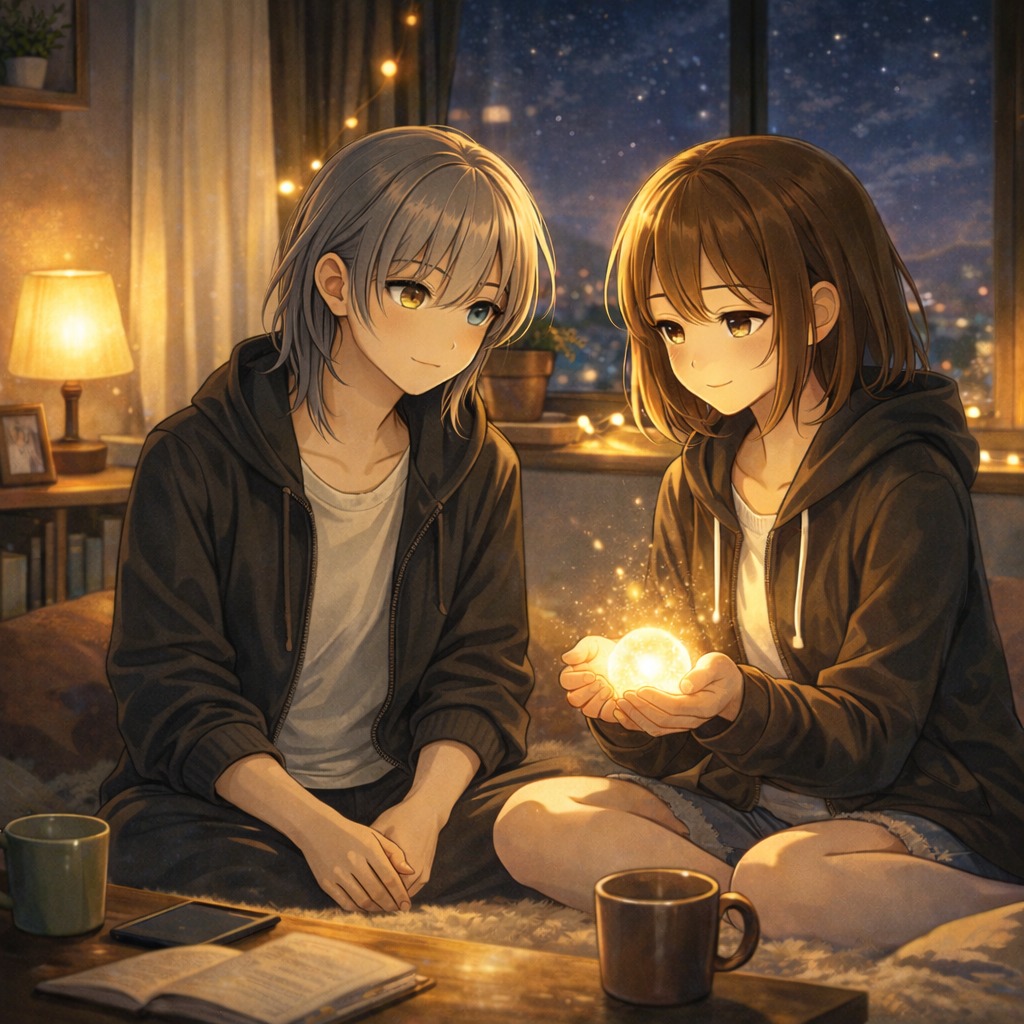 rio core, two female voices only, no male voice, soft cute female voices, bright and friendly tone, light and natural conversation, casual chatting like close friends, slightly airy voice, spoken word duet, relaxed podcast style, warm and intimate atmosphere, gentle lo-fi background, emotional but not heavy