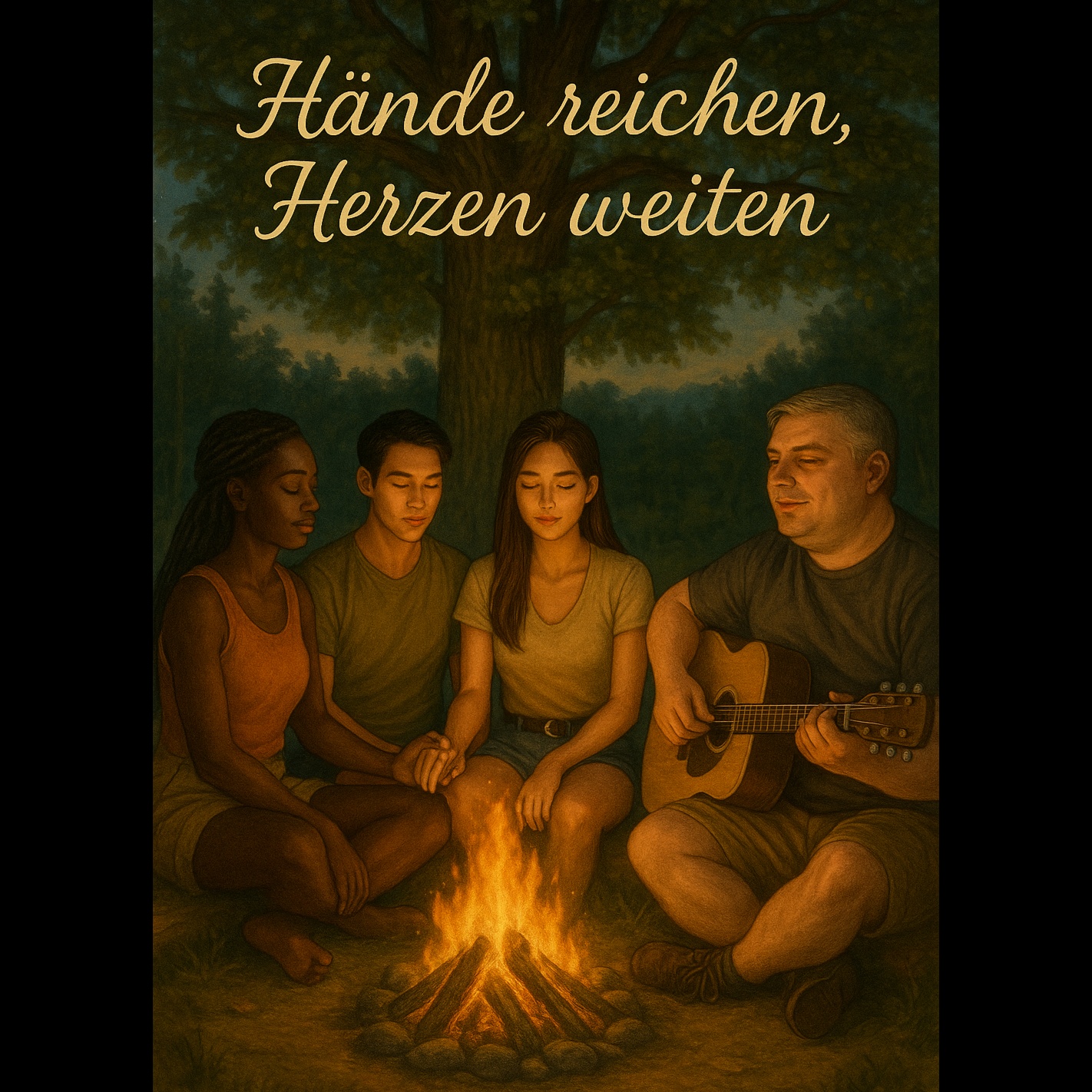 Acoustic campfire folk ballad, warm male & female vocals in harmony, soft fingerpicking guitar, natural ambient sounds (crackling fire, distant forest), cello undertones, emotional and sincere tone, poetic phrasing, deep dynamic swells in chorus, cinematic ambient bridge, heartfelt and peaceful atmosphere