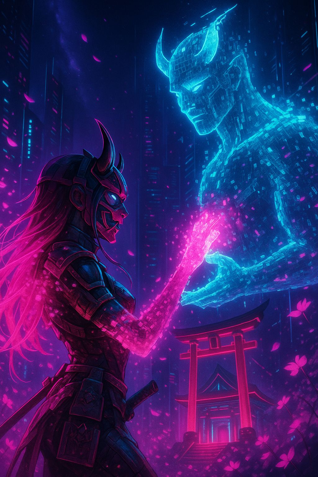 Neo-Edo cyberpunk atmosphere with soft neon ambience, Begin with drifting holographic cherry blossoms, airy pads, gentle koto plucks, and faint shakuhachi echoes, BPM ~118, Verses should feel quiet, mysterious, and lightly percussive, Bridge becomes cinematic with swelling synths, shimmering pink blossom effects, and spiritual Japanese vocals blended into digital reverb, First chorus brightens with sharp metallic koto stabs, warm bass pulses, and the feeling of the Blossom-Forged Blade awakening, Drop adds crisp cyber-EDM elements, blade-like synth slashes, glitch spark bursts, and rising neon energy, Verse 2 returns to soft calm, then rebuilds into an emotional pre-chorus, Final chorus is the biggest: glowing multi-layered synths, taiko-inspired deep hits, drifting cherry-petal arps, and triumphant cyber-shrine power, Outro fades with soft blossoms and digital wind, #cyberpunk #japanesefusion #neoncode