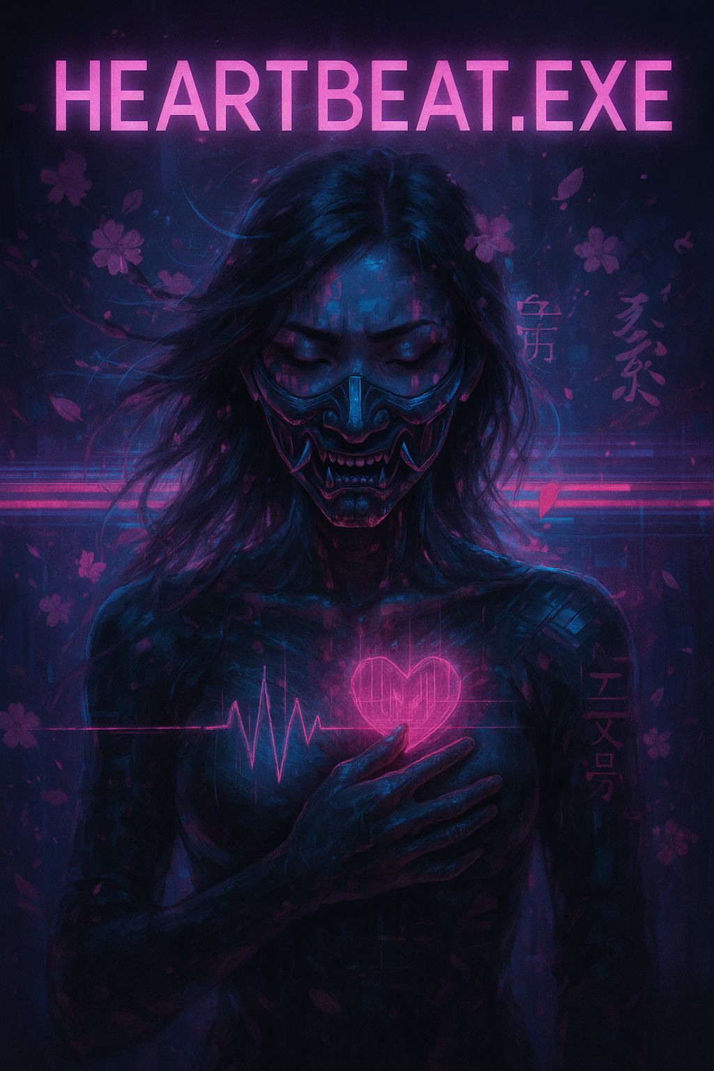 Emotional cyber-alt-pop fused with glitch-hop and drum & bass, Female lead vocals only, Verses are soft, intimate, and modern with airy pads and light glitch harmonics, Pre-chorus accelerates with DnB drums, pink-static FX, and vocal stutters, Chorus should feel huge, melodic, and euphoric with futuristic EDM-pop energy, Drops switch to glitch-hop: heavy bass growls, chopped vocals, data-static bursts, and Japanese chant fragments (“kokoro no kage”, “zankyou”), Use digital heartbeats, soft neon pads, and corrupted-signal textures, Tone is emotional yet futuristic: foreign yet familiar, BPM ~150 with halftime drops, Atmosphere is neon sorrow, fading humanity, synthetic breath, and corrupted memory glow, #edm #altpop #dnb #glitchhop #cyberpunk #neoncode