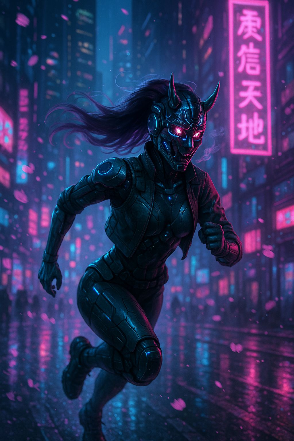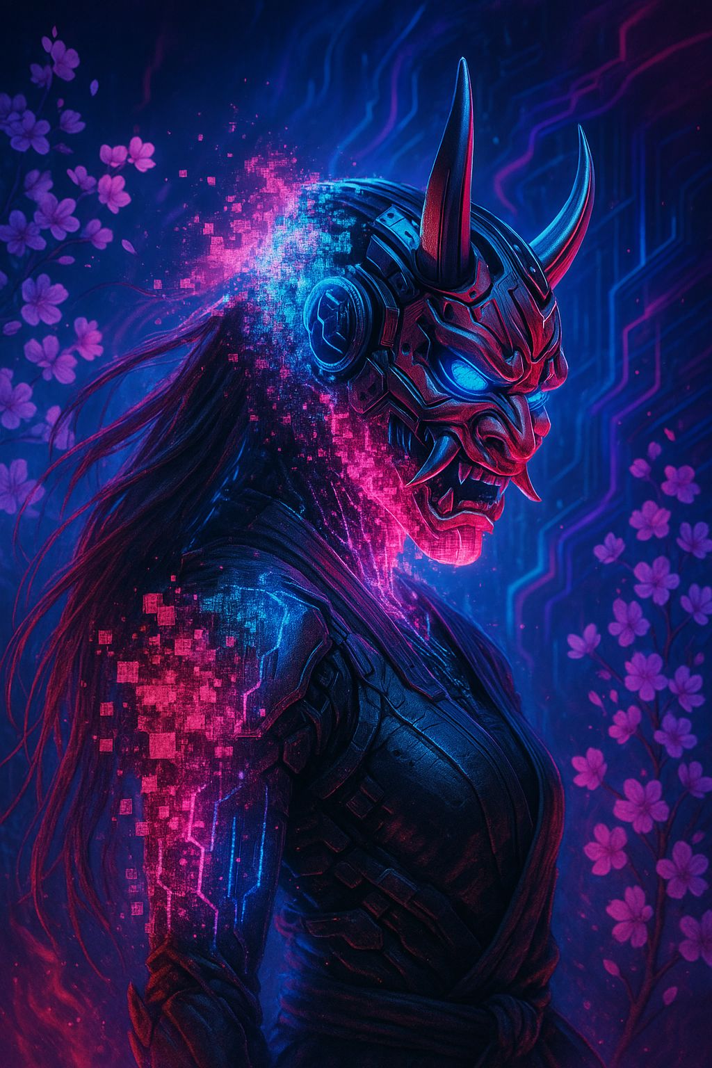 Cyber-Edo EDM-pop x aggressive dubstep with glitch-ascension energy, Female lead only, Verses melodic but unstable with slight pitch drifts and airy neon pads, Pre-chorus uses rising synths, pitch gradients, glitch stutters, and bright sakura shimmer, Chorus is huge, emotional, festival EDM with soaring leads and cyber-koto accents, Drops turn dark: distorted blade-synths, oni-like spectral growl harmonics, heavy LFO bass swells, glitch bursts, and stuttered Japanese chant FX (“oni no mezame”, “sakeru koe”), Use pitch-bent vocal FX, chopped syllables, digital tearing, and glitch vocals layered subtly, Mid-tempo EDM ~144 BPM with dubstep half-time on drops, Atmosphere: neon blossoms, fractal light, glitch aura, corrupted divinity, #cyberpunk #edm #dubstep #japanesefusion #neoncode