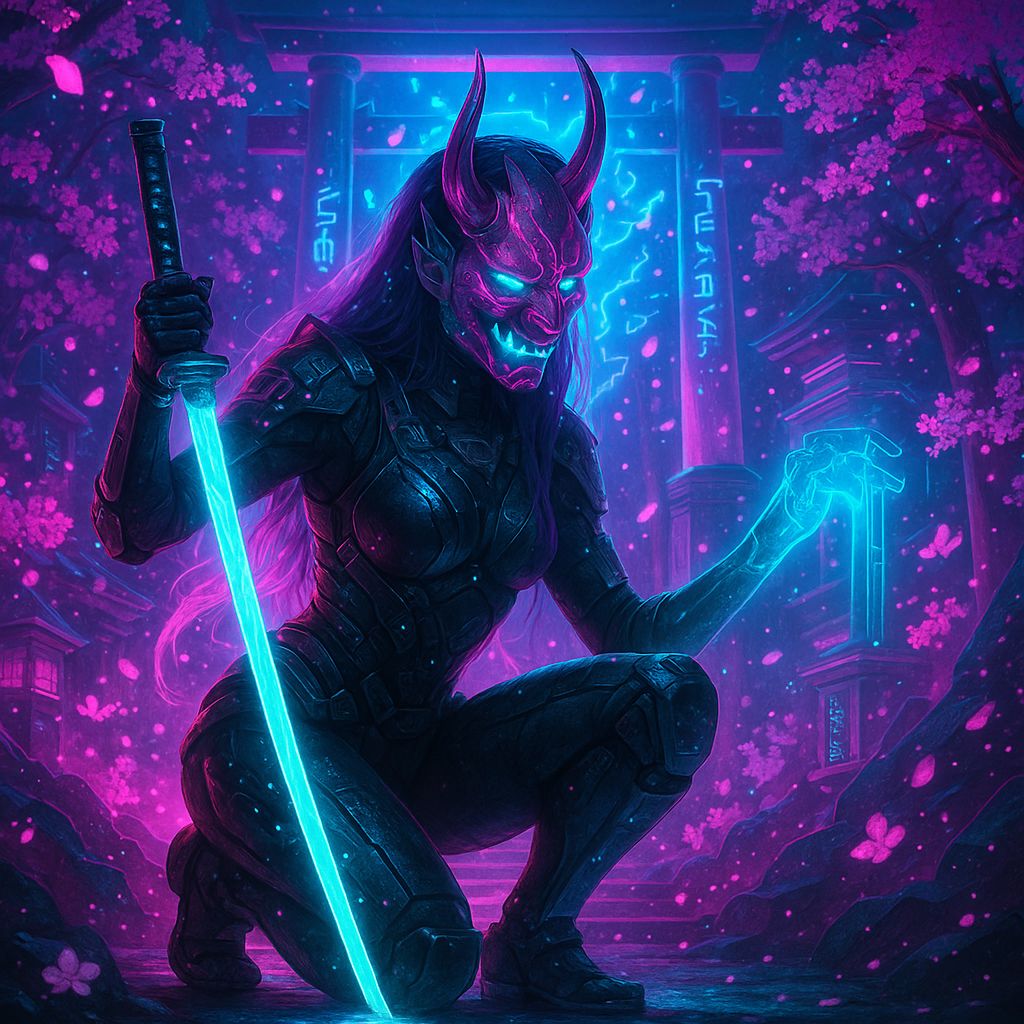 A futuristic cyber-samurai EDM/dubstep track set in Neo-Edo, opening the Neon Code saga, 150 BPM, F# minor, Aggressive trap-metal vocals with Japanese activation phrases (no chanting), Intro: stasis-chamber hum, glitch whispers, neon drones, digitized shakuhachi accents, Verse: rapid cyber-trap flow with metallic percussion, synth-koto plucks, glitch-treated shakuhachi leads, and blade-like synth stabs, Add cyber-taiko drums blended with EDM kicks for ritual pulse, Pre-drop: quiet Japanese phrases with glitch risers, Drop: massive dubstep hit with plasma-katana slashes, deep wubs, distorted bass growls, digitized koto arpeggios, neon synth leads, Bridge: robotic whispers, warped biwa-style echoes, glitch delays, Final chorus: cinematic pads, shimmering cyber-flutes, explosive taiko/synth layers, Mood: awakened, transcendent, neon-lit, Oni rebirth, #edm #dubstep #cyberpunk #trapmetal #oni #samurai #futuristic #neoncode