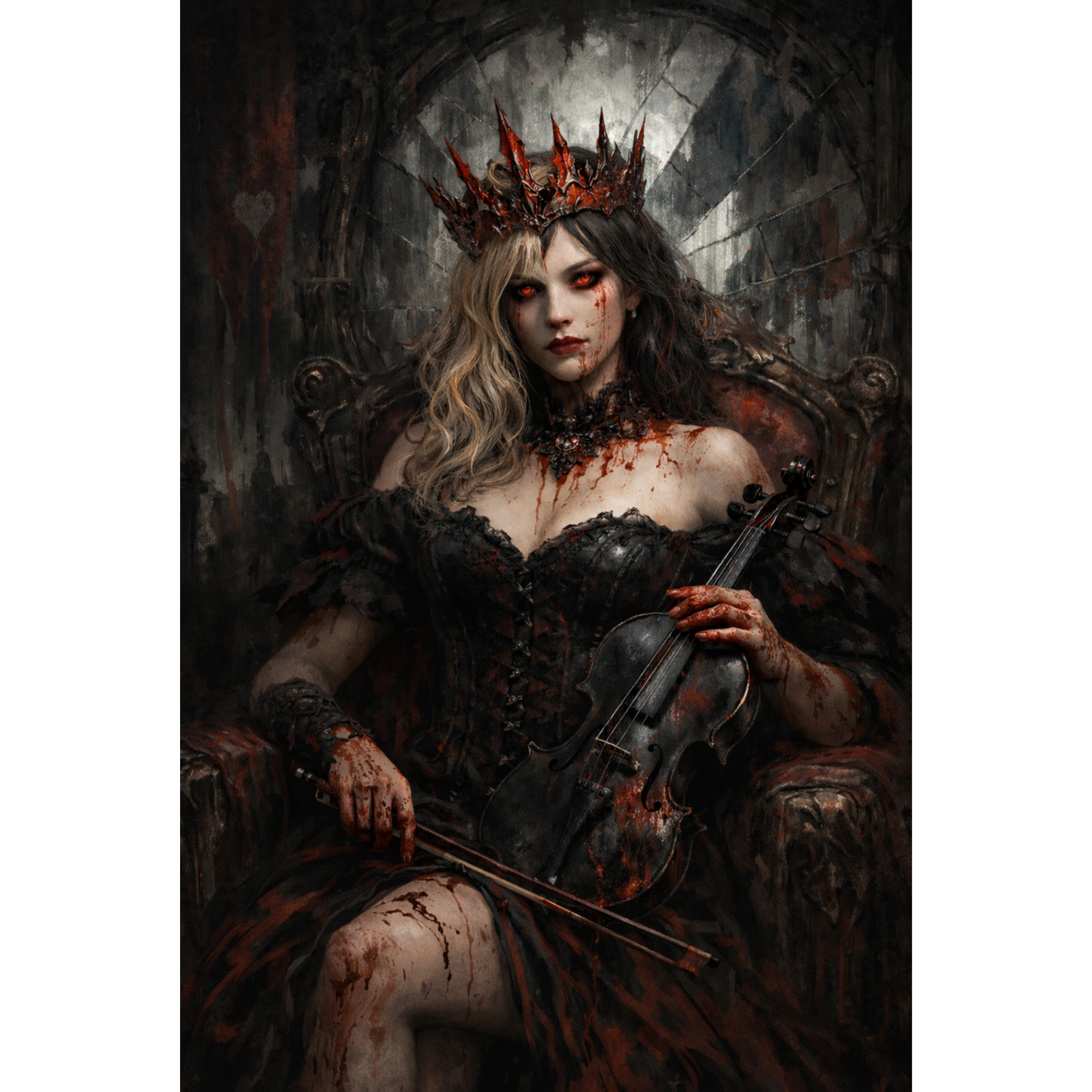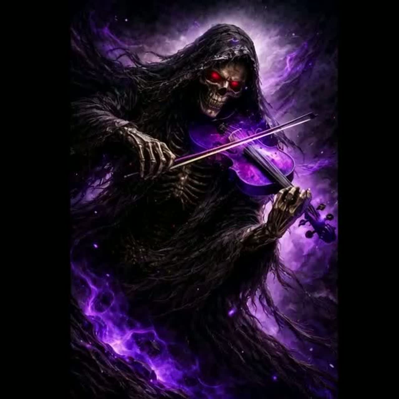 Dark thrash metal with death-gothic atmosphere, Fast to mid-fast tempo, aggressive and relentless, Heavy palm-muted guitars, sharp thrash riffing, double-kick drums, sudden stops and surges, No R&B, no swing, no groove elements, The Reaper plays a violent, distorted violin as a lead instrument, screeching, bow-dragged, ritualistic, sometimes melodic, sometimes chaotic, cutting through the mix like a blade, Male baritone vocal, harsh and commanding, half-sung half-spoken with controlled rasp and occasional near-growl, Lyrics and tone centered on death, soul harvest, inevitability, authority, and crossings, Atmosphere is apocalyptic, funereal, merciless, Dark choirs buried deep, minimal melody outside violin motifs, No heroism, no optimism, no celebration, This is death as law, fast and unforgiving