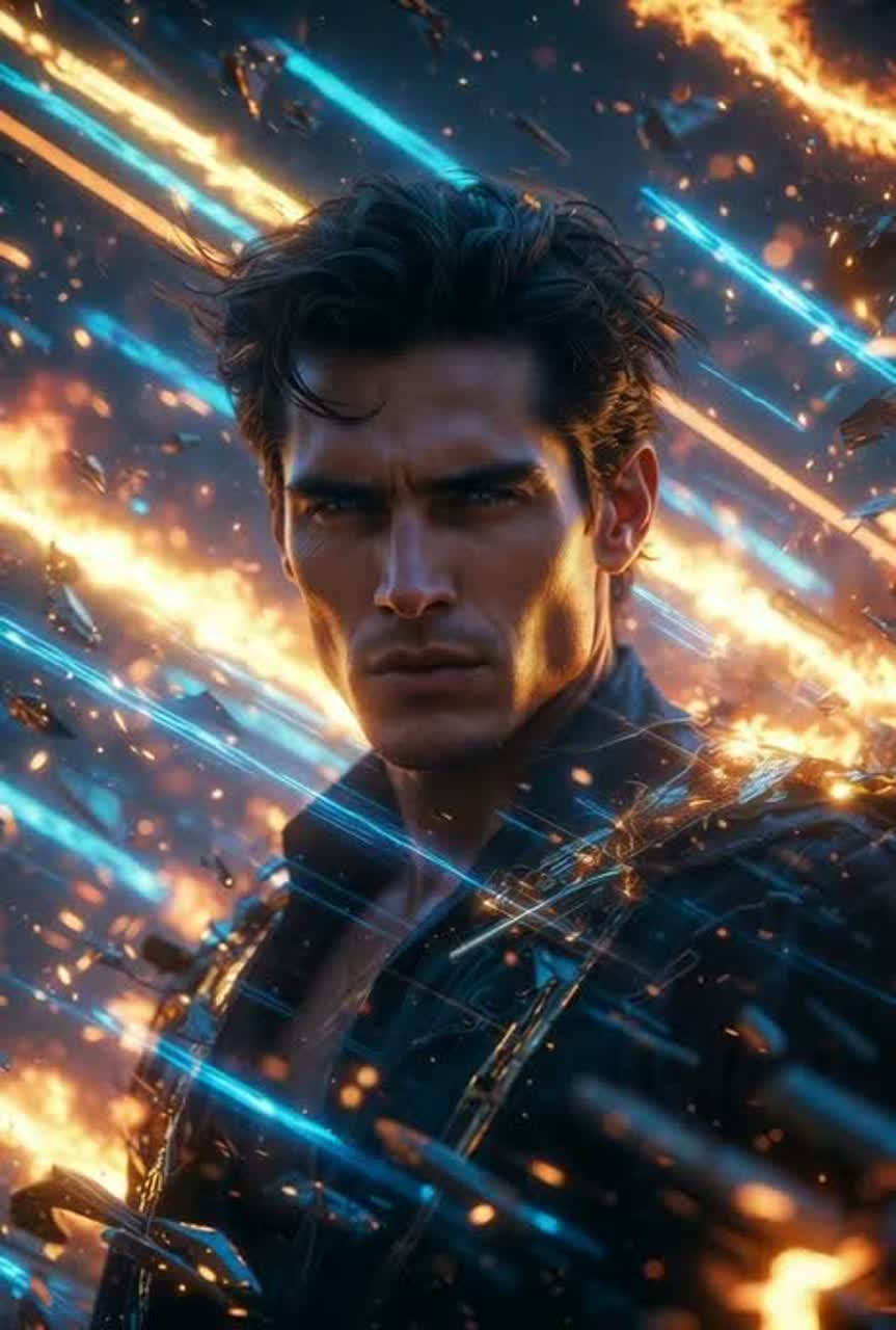 Layering: Metallic impact bed, shimmer bloom accents, dual-persona contrast