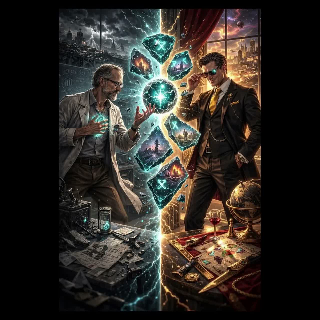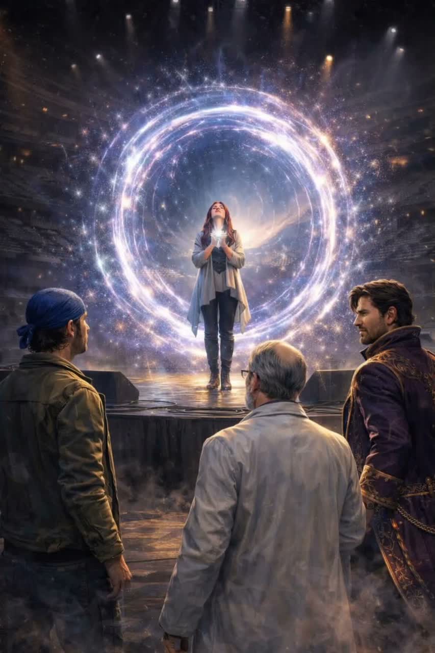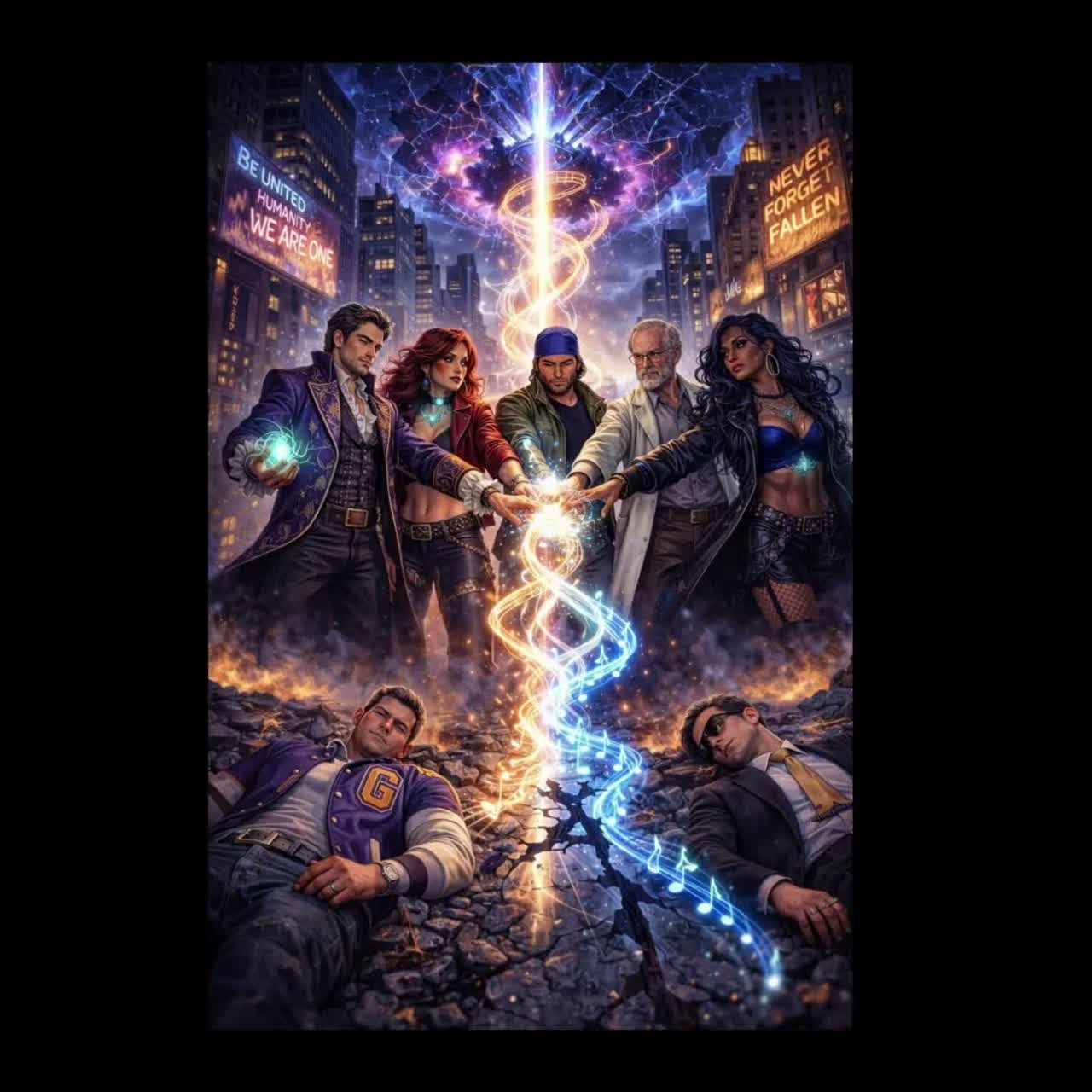 Epic major-key symphonic rock opera in G Major, structured in theatrical movements like Bohemian Rhapsody and Jesus Christ Superstar, Bright uplifting tonal center with triumphant arena-rock harmony built on A–D–E major progressions, Orchestra, choir, electric guitars, piano, Hammond organ, horns and cinematic drums, Multiple vocalists with alternating male and female leads, Nick and Skyler are the primary voices, with additional male and female singers representing other characters, Spoken narration passages, dramatic theatrical rock sections, a brief soulful blues-rock moment, and escalating symphonic tension, Inspired by Queen operatic rock, Flash Gordon soundtrack, and the Avengers Endgame portals scene, The arrangement gradually expands into a massive cinematic choir finale with layered guitars, orchestra and arena drums, Triumphant uplifting major-key energy in G Major throughout, No country sound, no pedal steel, no twang, ‑Country