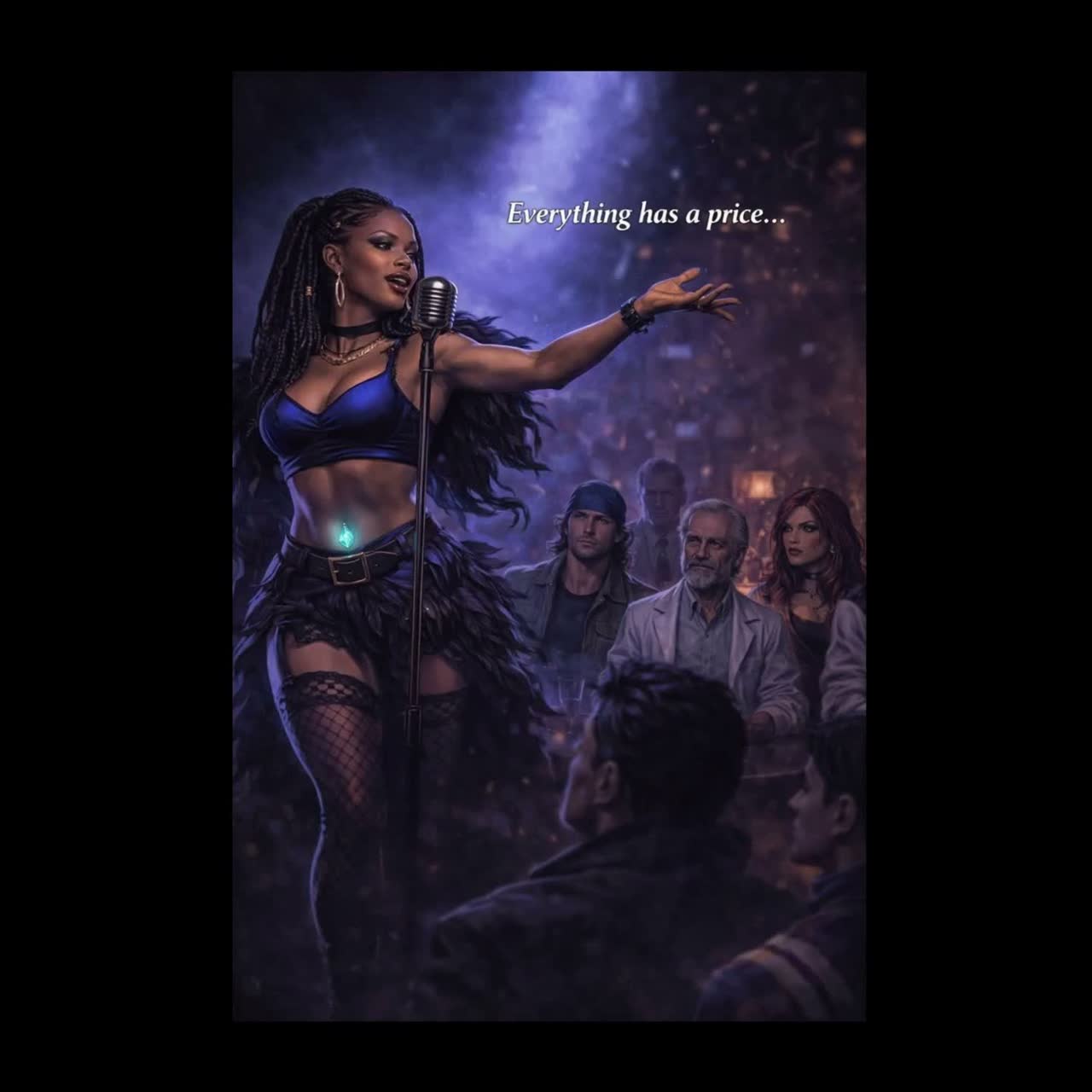 create a dark seductive neonoir pop soul song performed by a confident mysterious woman who believes the world runs on transactions rather than romance style blends sade elegance Soul, R&B, Jazz, Pop attitude Trip Hop, Electronic, Alternative Rock triphop atmosphere and modern swagger similar to Pop, Hip Hop, R&B Hip Hop, R&B, Pop and Hip Hop, Rap, Southern Hip Hop tempo 88 bpm in a minor with warm jazz harmony and cinematic polish mood cool intelligent sensual slightly dangerous and latenight instrumentation rhodes electric piano deep sub bass brushed drums subtle breakbeat groove minimal electric guitar textures and warm synth pads vocal intimate smoky expressive and playful like a burlesque lounge performance lyrics explain that love loyalty power and success always involve hidden costs and tradeoffs chorus hook repeats everything has a price melody uses descending phrases while the music subtly hints at a mysterious fournote motif suggesting a hidden cosmic connection