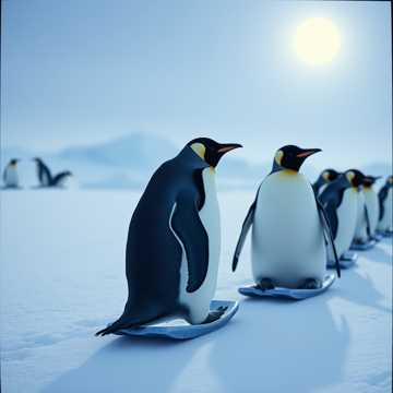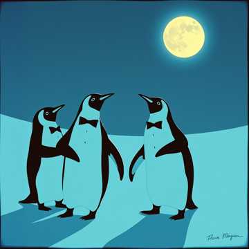Electro-swing Ă big-band kids bop; 122â126 BPM, bright major, Lead: playful narrator + kid-gang responses (âwaddle-waddle!â), Instruments: upright bass walk, brass stabs, jazz guitar comp, brushed kit with 4-on-the-floor, clarinet/sax fills, handclaps; brief tap-style rim clicks, Hook = âTuxedo shuffle / slide and glide, â Short pop-drop after each chorus (just bass, claps, vox), Flow: Brass riff â V1 (moonlight on ice) â Pre (count-in) â BIG Chorus â V2 (spins/slides) â Chorus â Call-and-response Bridge â Final Chorus + tag, Mood: cartoon-classy, high-energy, dance-along