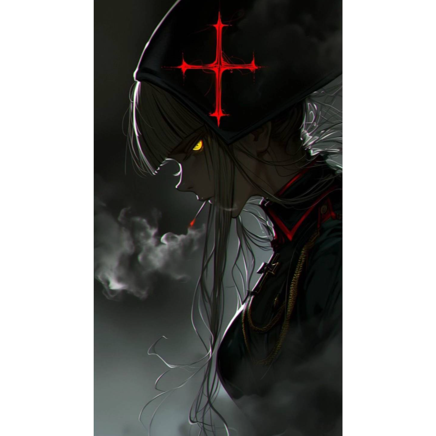 A high-energy orchestra symphonic gothic track with dark trance and dramatic atmosphere, fast-paced tempo around 130 BPM, Dark edm trance with distorted electric guitar riffs blended with orchestra, dominant Gregorian choir and church organ, Powerful hybrid orchestration mixing cinematic strings, intense brass, deep choir chants (Latin choir, dark female choir, ethereal female choir), and heavy taiko-style percussion, Vocals: dual female—angelic intimate cleans, feral fry screams for stabs, FX: heartbeat thumps, door-latch click before drops, Dramatic build-ups with sudden silence and explosive hits, Layered violins and cellos driving the melody, accented with low brass stabs and pounding war drums, Intense staccato strings for tension, soaring choir for epic climax, and eerie reverb for atmosphere, Mood: dark faith, tragic, heroic, desperate battle, cinematic anime boss theme