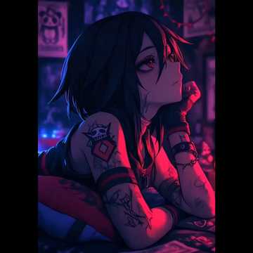 (Dark, claustrophobic, unsettling yet danceable; cyberpunk underground club with creepy carnival edge, cute-but-deadly]