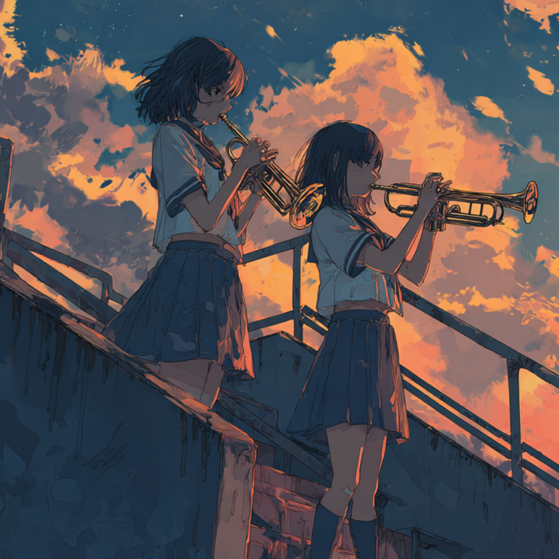A female-voiced J-pop brass-pop track with a nostalgic yet uplifting character, Verses are intimate and natural, set against muted trumpet stabs, light pads, and marching snare ticks, Choruses expand into bright, layered brass harmonies and glockenspiel sparkles, projecting strength and optimism, BPM 118, mid-up tempo, The mood is after-school secrecy and shared courage on a sunlit stairwell, where overlapping sounds carry unspoken determination into tomorrow
