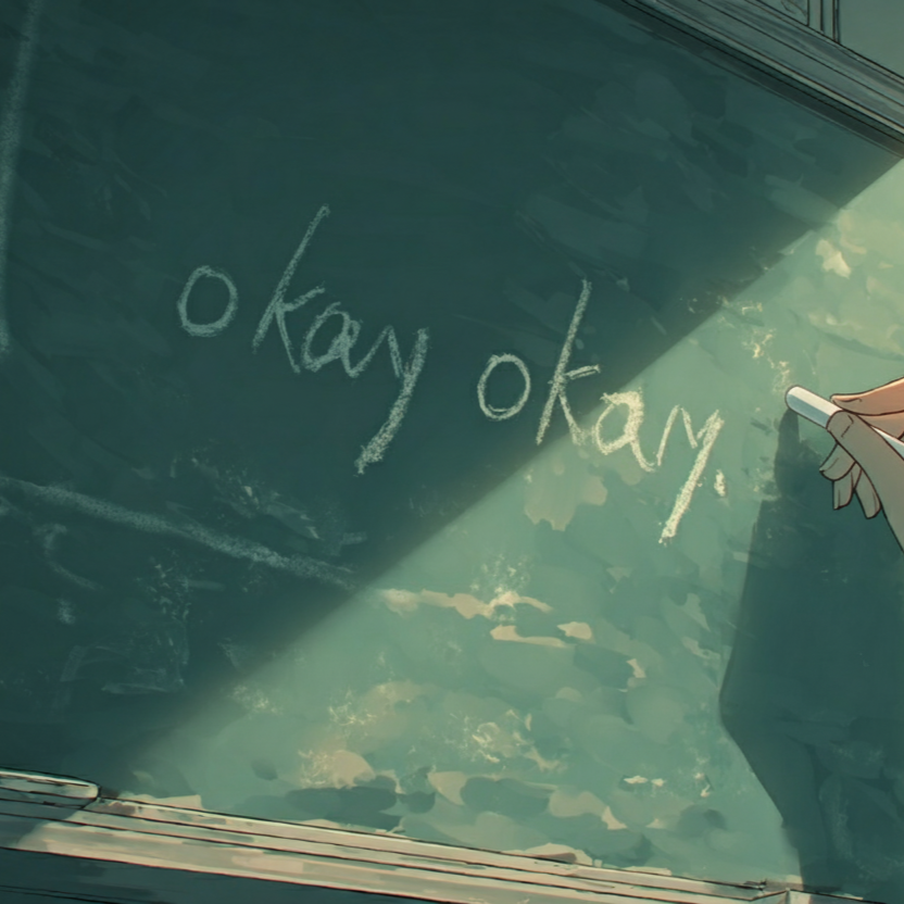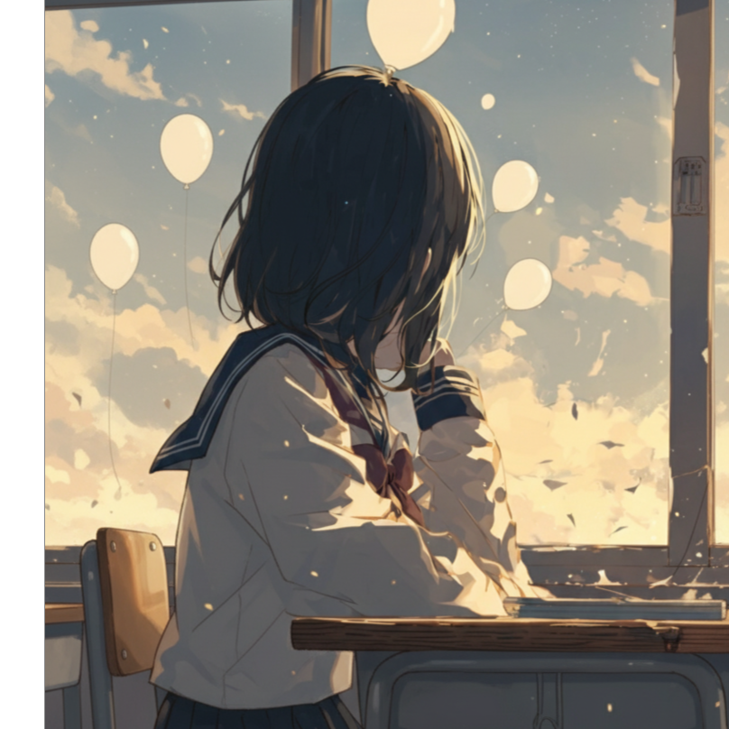 A female-voiced J-pop ballad with light indie-pop color, set in a quiet classroom afternoon, Whispery verses capture fragile self-doubt, while airy choruses bloom with overlapping children’s choir, Acoustic guitar, toy piano, and soft claps underline a tender rhythm, turning mistakes into colors and floating them like white balloons in the sky