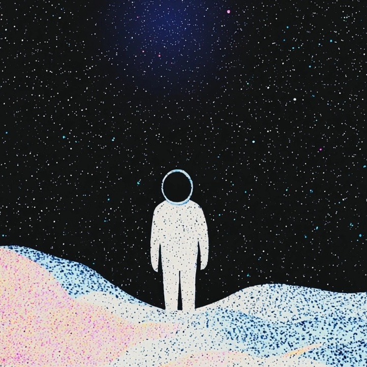 soviet post-punk, new-wave, Celestial synth swells and gravitational arpeggiators drift into orbit, layered with distant pulses of analog static and low-gravity drum loops echoing across interstellar space, Warped, reverb-soaked guitars shimmer like distant starlight, their tones modulated as if warped by black hole distortion, Alien vocal textures—processed through granular synthesis and spectral filters—float untethered, dissolving into shimmering ambient nebulae, Fragmented melodies emerge like signals from an ancient satellite, cloaked in cosmic dust and tape-saturated nostalgia, The arrangement defies terrestrial structure, morphing through wormholes of dreamy dissonance and surreal tonal shifts, Cosmic dreamgaze and astral neo-pop converge through drifting synth layers, deteriorated rhythms, and star-bent harmonics, evoking a soundscape both infinite and intimate