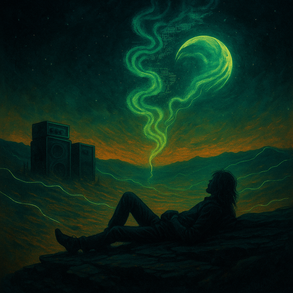 [At 72–76 BPM (or 144–152 halftime), build a heavy, hypnotic track fusing slow fuzz-guitar riffs with deep modulated bass and trippy atmospheric layers, Verses carry low, reverb-soaked vocals ~ half chanted, half drawn-out, with desert heat and cosmic haze, Guitars tuned low with analog fuzz and phaser movement; basslines modulate like breathing machinery, Drops explode with FM growls, slow triplet wubs, and guitar feedback woven into the bass texture, Dubby delay trails and reversed cymbals shape space; rhythm swings between sludge groove and halftime stomp, Mix weighty and immersive ~ smoke-thick, spatial, and hallucinatory; sound should drift, pulse, and rumble like the Earth exhaling through an amp stack, ]