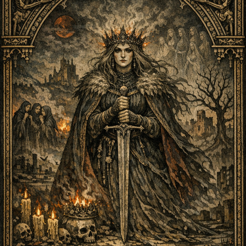 Ouverture solennelle avec orgue ample et continuo de viole de gambe installant une tension grave, Voix de baryton posée au premier plan, soutenue de chœurs masculins distants, Arrangement gothique renaissance, ponctué de touches de luth et percussions feutrées pour l’élan épique, ‑voix feminine