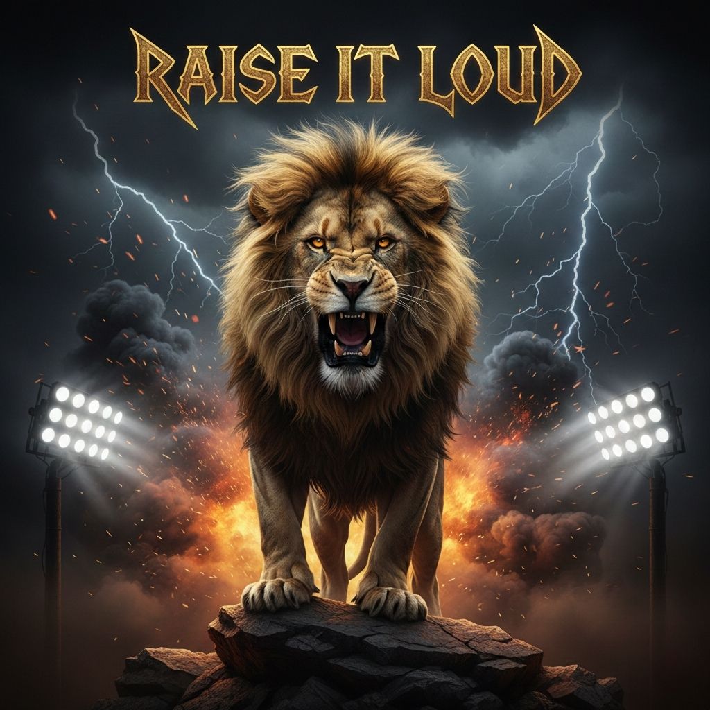 A high-energy hard rock anthem driven by thick, distorted guitar riffs and aggressive power-chord verses over a relentless 160 BPM rock drum groove, Raspy, commanding male lead vocals deliver chant-ready melodies, with gang-style backing vocals exploding in massive stadium choruses, Verses stay tight and punchy, pre-choruses build tension, and choruses hit with triumphant hooks, A long, melodic heroic guitar solo features wide bends and fast runs, followed by a dramatic bridge and an epic double final chorus that fades out on sustained, soaring guitars
