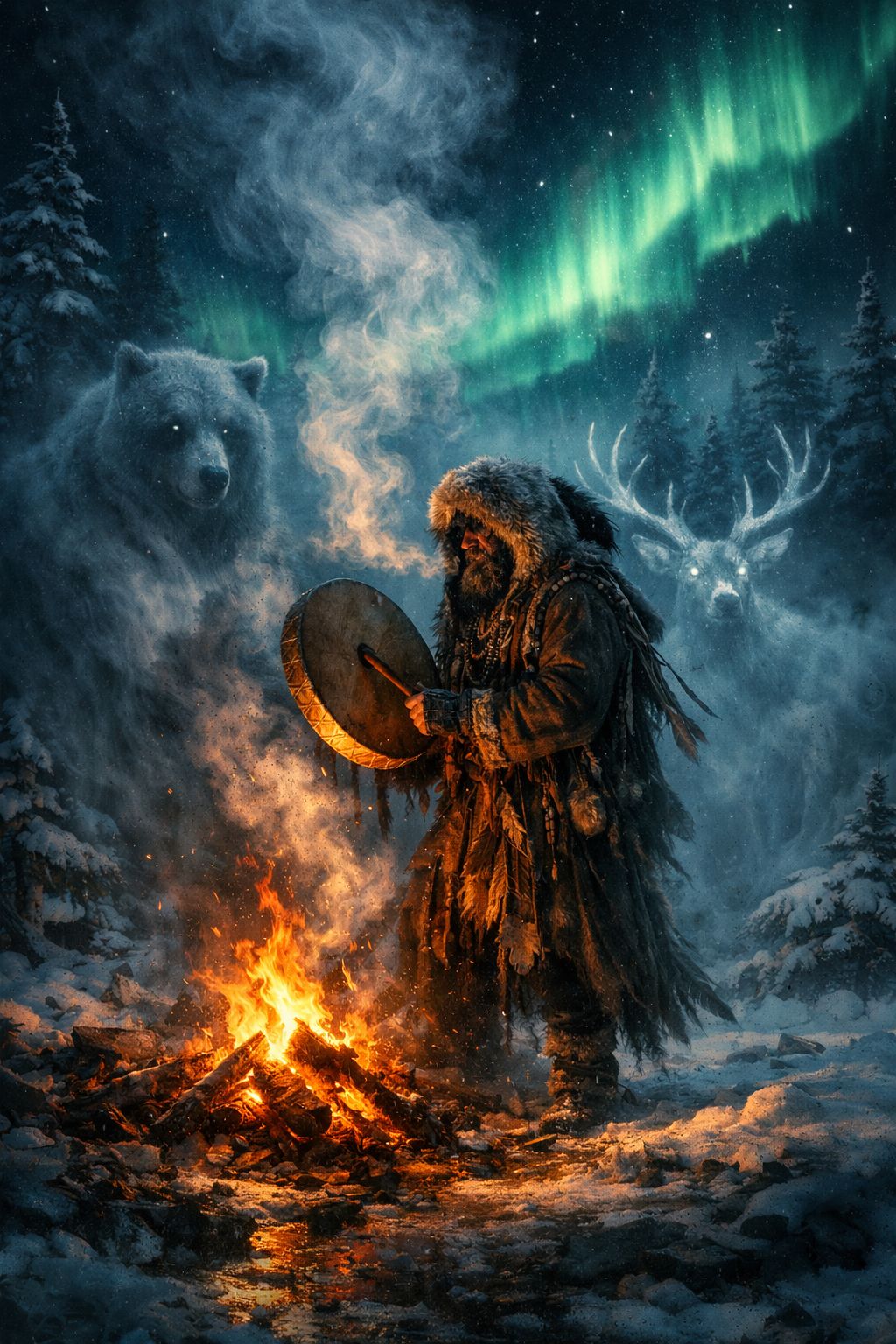Hypnotic and meditative rhythm, slow rocking tempo (60-70 BPM), Raw groove voice with grit and uneven breath, slightly offbeat pulse, Tribal percussion, deep drum, wooden hits, subtle bass resonance, Layered male throat voices blending with whisper chants, Occasional pauses and syncopated accents — feel of walking through snow and breathing with the wind, Soundscape: cold wind, aurora shimmer, shamanic trance, Emotional tone: mystical, ancient, meditative, powerful and primal, Genre: ethnic ambient / deep folk trance / spiritual northern chant