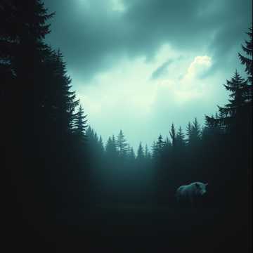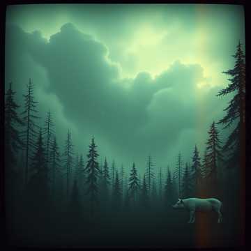 65 bpm, key E minor, eerie, dark folk, glitchcore, stuttercore, d&b, dubstep, long reverb everywhere, organic, electronic, acoustic, nature sounds (pig snort, pig squeal, wolf howl, wolf snarl, powerful thunder)