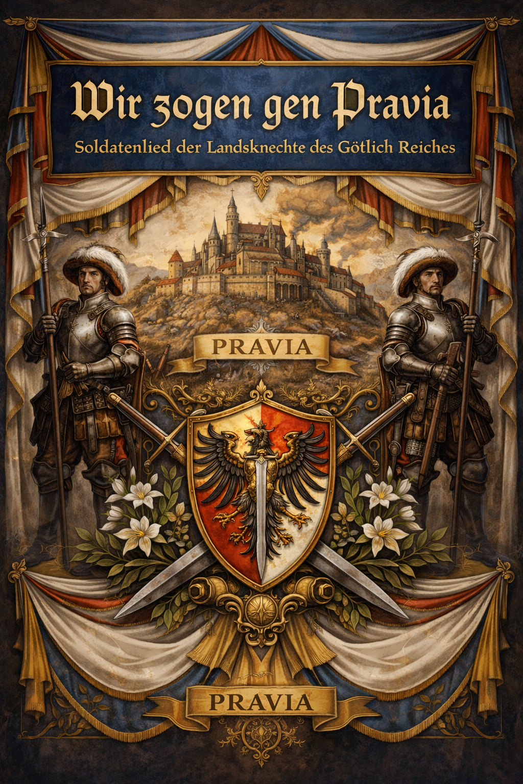 A Central European folk anthem with a solemn, noble, and sacral character, featuring a mixed choir with a strong male lead and restrained female harmonies, The song is in a major key with subtle modal tones, at a moderate, processional tempo, evoking an ancient ceremonial march rather than an aggressive military charge, Instrumentation includes warm brass (French horns and trombones), restrained ceremonial trumpets, pipe organ, and low strings supporting a hymn-like melody, Percussion is minimal and ceremonial, using slow drums to emphasize gravity and tradition, The choir sings in measured unison and simple harmonies with a reverent, authoritative delivery, as if performed in a cathedral or great hall, Production is spacious and clean, with noticeable reverb on choir and organ to create a sacred, monumental atmosphere, The structure follows verse-chorus form with a strong, memorable refrain, The harmonic progression is mostly diatonic with light medieval and early renaissance influenc