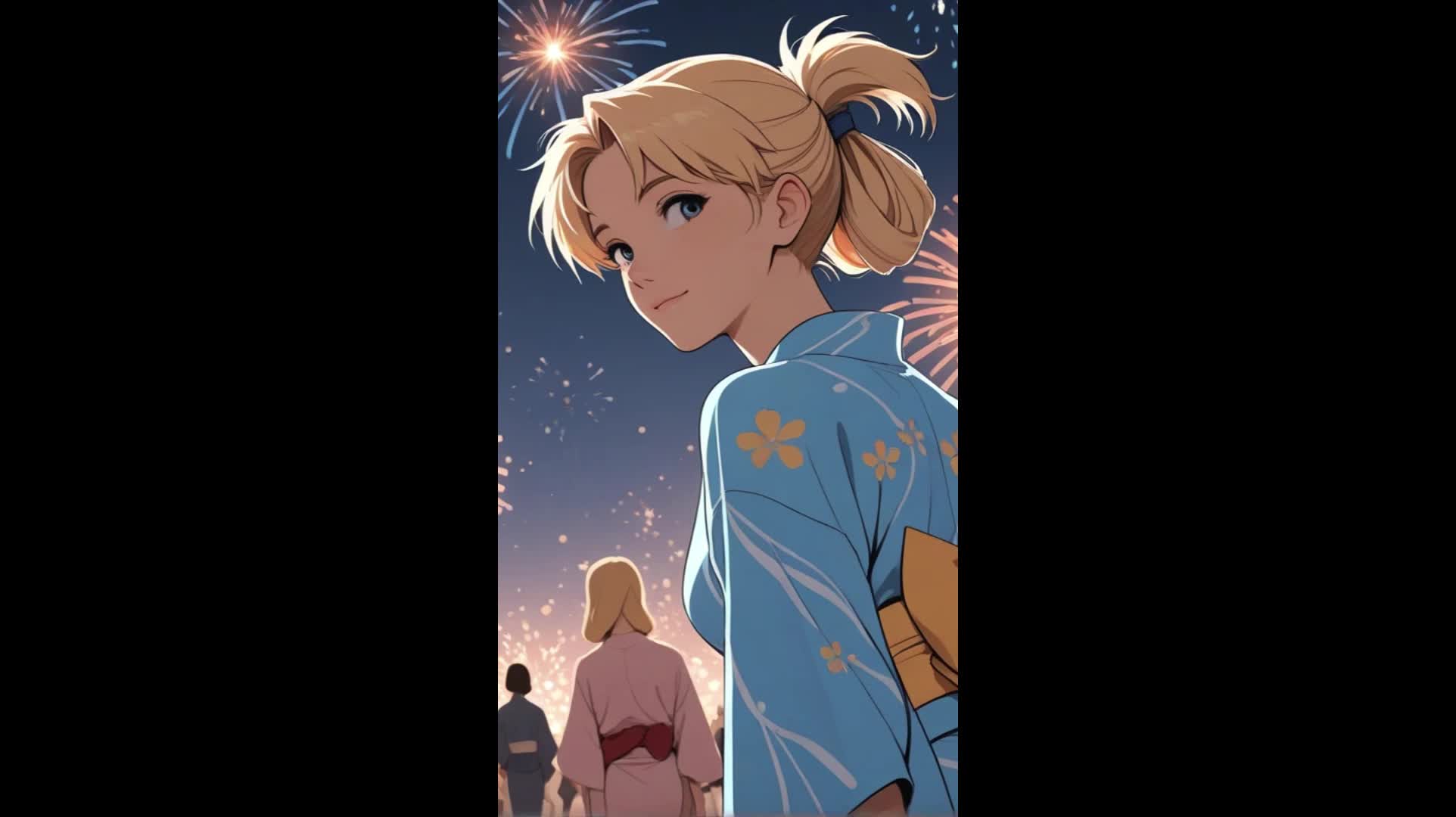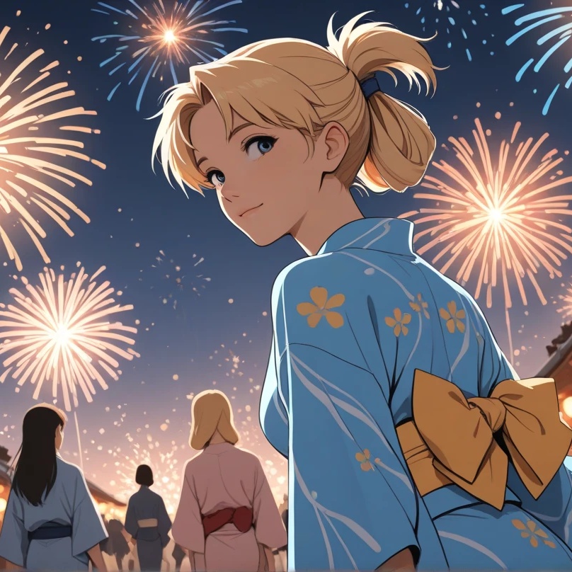 Create a soft acoustic Japanese pop ballad with gentle guitar, ambient sounds, and subtle traditional Japanese instruments like koto or shakuhachi, Theme: a bittersweet summer memory of a girl watching fireworks with her crush, Calm, nostalgic, and romantic