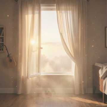 Intimate sunrise acoustic ballad, 80 BPM, key C major with subtle Lydian color, ultra high fidelity, wide dynamic range, minimal compression, natural transient detail, soft fingerstyle acoustic guitar and warm piano intro, airy ambient pad with subtle morning atmosphere and light wind and distant birds, no heavy drums, optional very soft brush or heartbeat pulse, Male vocal very close-mic, breathy and intimate in verses, almost whisper-like delivery, gentle legato phrasing, emotional but restrained, Chorus opens slightly with warm tone, soft push on key words like “open heart” and “light”, still controlled and not powerful, Final chorus relaxed, peaceful, with more air and acceptance, Gradual emotional arc from hazy intro to clear and warm chorus, representing inner awakening from illusion to clarity, Add gentle strings in chorus for lift, Extremely clean mix, spatial depth, realistic stereo imaging, organic human sound, sunrise awakening feeling