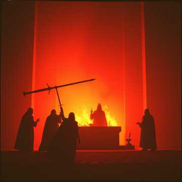The anthem launches with deep taiko and tribal drums driving a medium-fast pulse, underscored by roaring low male vocals and sweeping cinematic strings, Verses feature gritty orchestral textures with syncopated brass and tense percussion, Choruses explode into ethereal choirs, huge orchestral swells, and layered drums, evoking a battle of epic scale, No guitars—only powerful, organic orchestral and vocal elements, conjuring a feeling of relentless divine force and ancient majesty