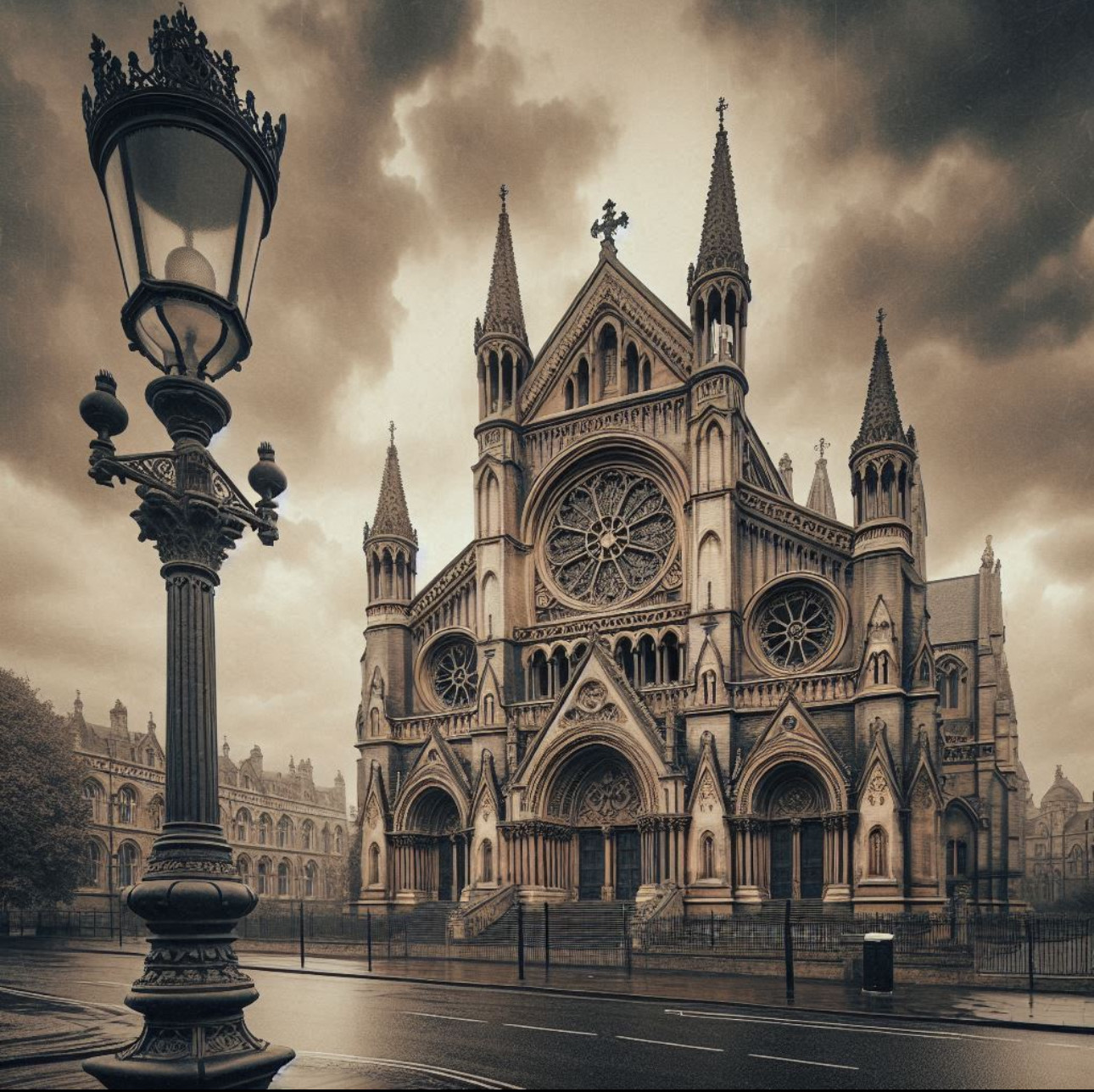 cinematic dark narration with echoing male and female voices, ominous orchestral build, metallic drones, church bells, industrial soundscape, gothic mood, steampunk mystery, perfect for lore interlude between songs