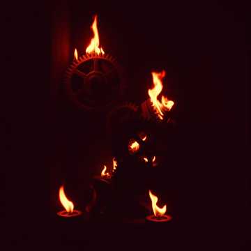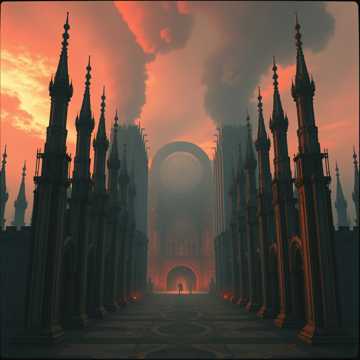 Opening with low drones, ticking clockwork, and distant cathedral choirs, ritualistic drums slowly join, pulsing beneath eerie synths and metallic sound design, Deep gothic male vocals enter over sparse folk instrumentation, evolving into layers of heavy guitars and soaring orchestration, The arrangement swells with pounding percussion and epic metal elements, reaching a grand, orchestral climax woven with mechanical textures and haunting choir