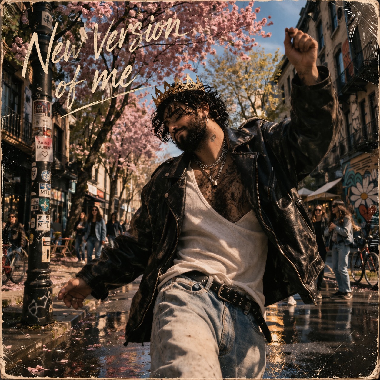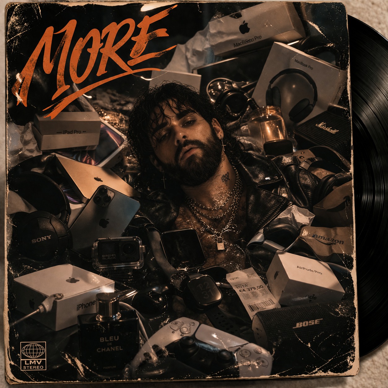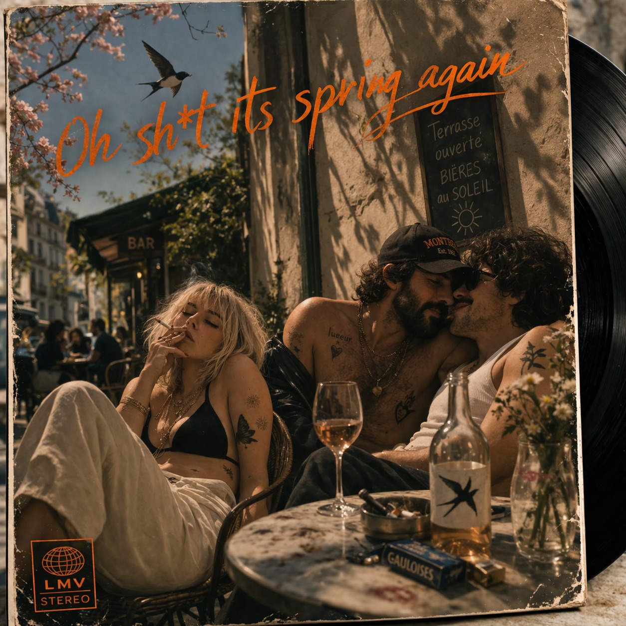 strong vinyl crackle, warm vintage tone, singable and danceable Belgian club electro, minimal house, Distorted synths, gritty bassline, and heavy Brazilian-style percussion, Minimalist but punchy, dark, and perfect for a sweaty underground club, Tempo mid-to-fast, raw, ironic, and hypnotic, Vocals in French: verses are half-spoken, detached, and provocative — gritty, confessional, darkly humorous, with flashes of fragile emotion breaking through, Choruses are sung in a higher, sexy, melodic register with layered backing vocals and gospel choir, creating a sharp contrast with the verses, Add trumpets when needed, Lyrics feel poetic, ironic, and slightly trashy, mixing self-reflection, lust, and dark humor, The overall vibe is intimate yet claustrophobic — like a late-night confession screamed through a dirty synth, "