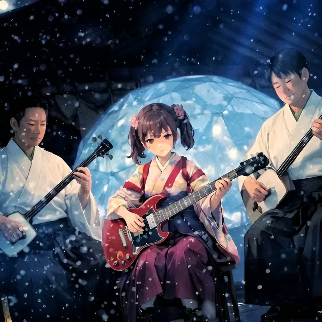 Experimental fusion song combining traditional Japanese shamisen riffs with fast-paced jungle drum breaks and ragga-style rhythmic accents, The shamisen plays continuously across all sections, driving the rhythm with sharp, percussive strumming and standing out as a distinctly organic and foreign texture against the electronic and metal elements, Its phrases often intertwine with electric guitar lines, creating rhythmic interplay, call-and-response motifs, and synchronized accents that blur the boundary between folk and metal, Analog synth organ provides a warm, retro electronic layer, while chord progressions are inspired by 1980s city pop, using jazzy major 7ths and emotional modulations, The bass adopts a loop-driven industrial rock approach — aggressive, mechanical, and repetitive — anchoring the track with gritty low-end pressure and creating a hypnotic pulse that reinforces the chaotic groove, kawaii girl vocal
