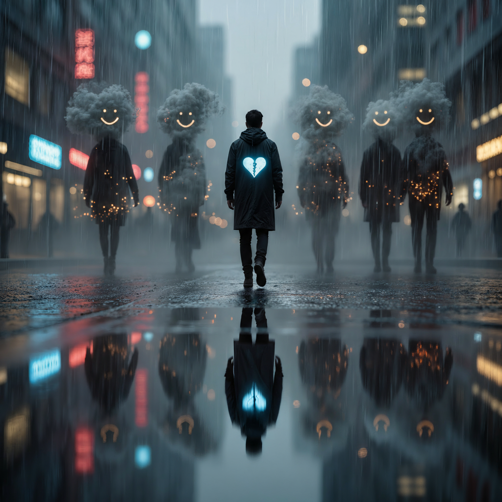 Hard Rock / Alternative / Emo hybrid, Clean electric guitars and subtle drums shape introspective verses, while the chorus bursts into overdriven power and emotion, The singer walks through crowded streets filled with people pretending to be happy, recognizing their hidden loneliness as his own reflection, The song balances melancholy with energy — emotional grit, wide choruses, and haunting guitar tones
