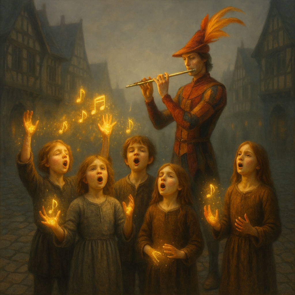 Genre: German melodic rock, hard rock, and symphonic pop interwoven with folklore motifs, Style: Dramatic storytelling shaped into a bold anthem with poetic narrative and mythical depth, Singer's Voice: Rough-edged female voice with a subtle British accent; emotive, expressive, lyrical, Instrumentation: Electric guitars, bass, drums, orchestral synths, featured melodic flute (leading in verses and intro), expressive children’s choir, atmospheric layers, Mastering: Stereo mix with orchestral depth, clarity in dynamics and balance — studio quality, high-fidelity, best quality production, professional mix, mastered sound