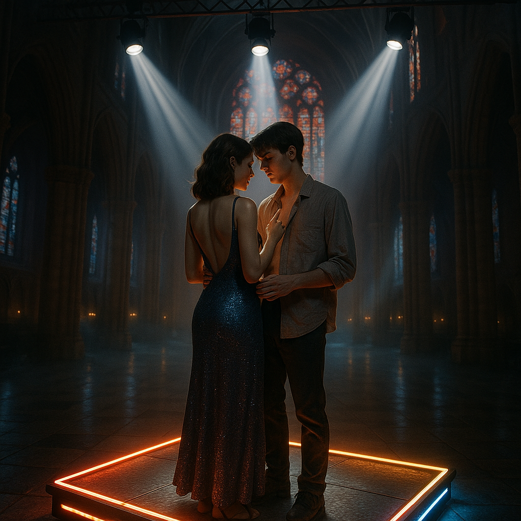 An opulent and decadent fusion of Gothic Trap Opera and cinematic Baroque Pop, with a dark, sensual, and theatrical atmosphere, The production creates a vast, sacred space by blending a haunting cathedral pipe organ and ghostly Gregorian choirs with the raw, physical power of a deep, distorted 808 sub-bass and crisp, syncopated trap hi-hats, The arrangement is a dynamic journey, with verses built on whispered intimacy and shimmering darkwave synth layers, swelling into a dramatic, romantic pre-chorus with soaring orchestral strings, The chorus explodes into a lush, powerful trap rhythm that feels both sacred and profane, The lead vocal is a whispered, sensual, and breathy female delivery that feels both seductive and dangerous, like a succubus in a confessional, The overall mood is a theatrical and atmospheric dark romance, balancing mystique, desire, and raw power