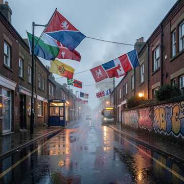 rap, Gritty UK rap cypher energy, mid-tempo drill-adjacent bounce with sliding bass and razor hi-hats, Each verse shifts accent colour through subtle melodic inflections; hooks stack chanted gang vocals on the title phrase, Dark keys and distant sirens under the beat; occasional filter sweeps to spotlight the storytelling, Male vocals, close-mic, raw, with doubled lines on key punch-ins