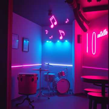 Cuban Jazz, 1930's, big band inspired, Gruff male vocal, brass section, percussion section, stand up bass, mandolin; Neon art deco ballroom, neon bar, neon bandstand, neon art deco