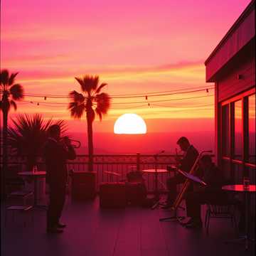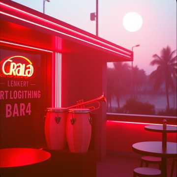 Cuban big band, 1930's jazz, scratchy female vocal, mixed vocals, trumpet, brass section, percussion, string section; neon brass band stands, neon ballroom, neon bar, neon sunset, neon patio