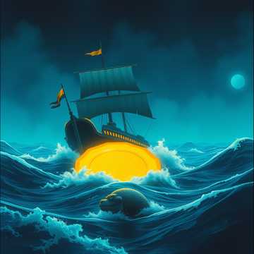 Cuban big band, 1930's, scratchy male vocal, concertina, tuba; neon ship, neon ocean, neon figure in the sea; neon sea monster, neon golden plate