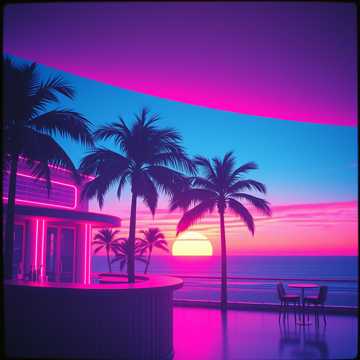Cuban, slow guitar, 1930's jazz, gruff male vocal, Spanish guitar, maraca, snapping fingers, slow clap; neon sunset over ocean; neon ball room, neon art deco bar