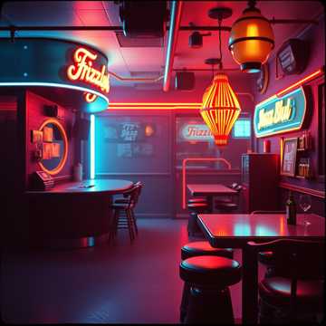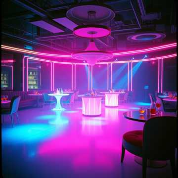 1930's jazz, sultry female vocal, heavy cello, guitar, tom-tom, high hat, muted trumpet; Neon stage, neon bar, neon ballroom