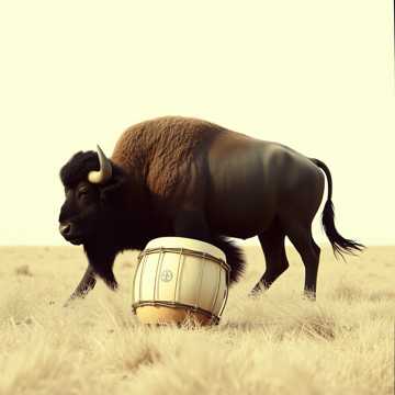ceremonial, medicine wheel vibe, strong deep drums you can feel in your bones as the buffalo shakes the ground he walks