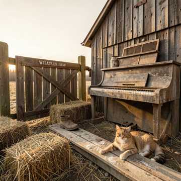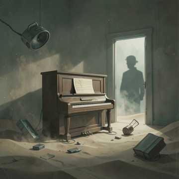Ghost town piano, eerie western saloon, detuned upright piano, broken swing rhythm, minimal jazz, slow brush drums, distant upright bass, muted trumpet accents, sparse instrumentation, cinematic western ambience, uncanny calm, subtle tension, empty saloon atmosphere, haunting but not scary, surreal western mood, soft dynamics, negative space focus, whisper vocals, intimate close vocal delivery, minimalist arrangement