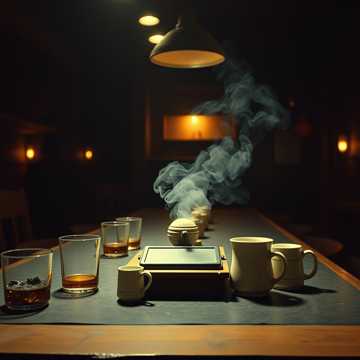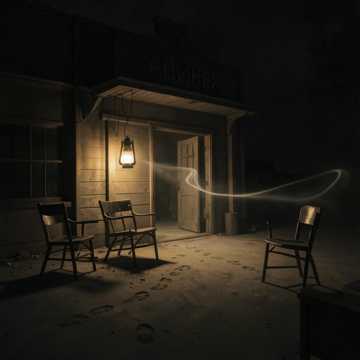 Ghost town piano, soft western swing, minimal brush drums, distant upright bass, saloon ambience at night, muted accordion echoes, slow cinematic pacing, warm but uneasy tone, fragmented ensemble vocals, whisper elements, surreal western atmosphere, subtle tension, unresolved harmony