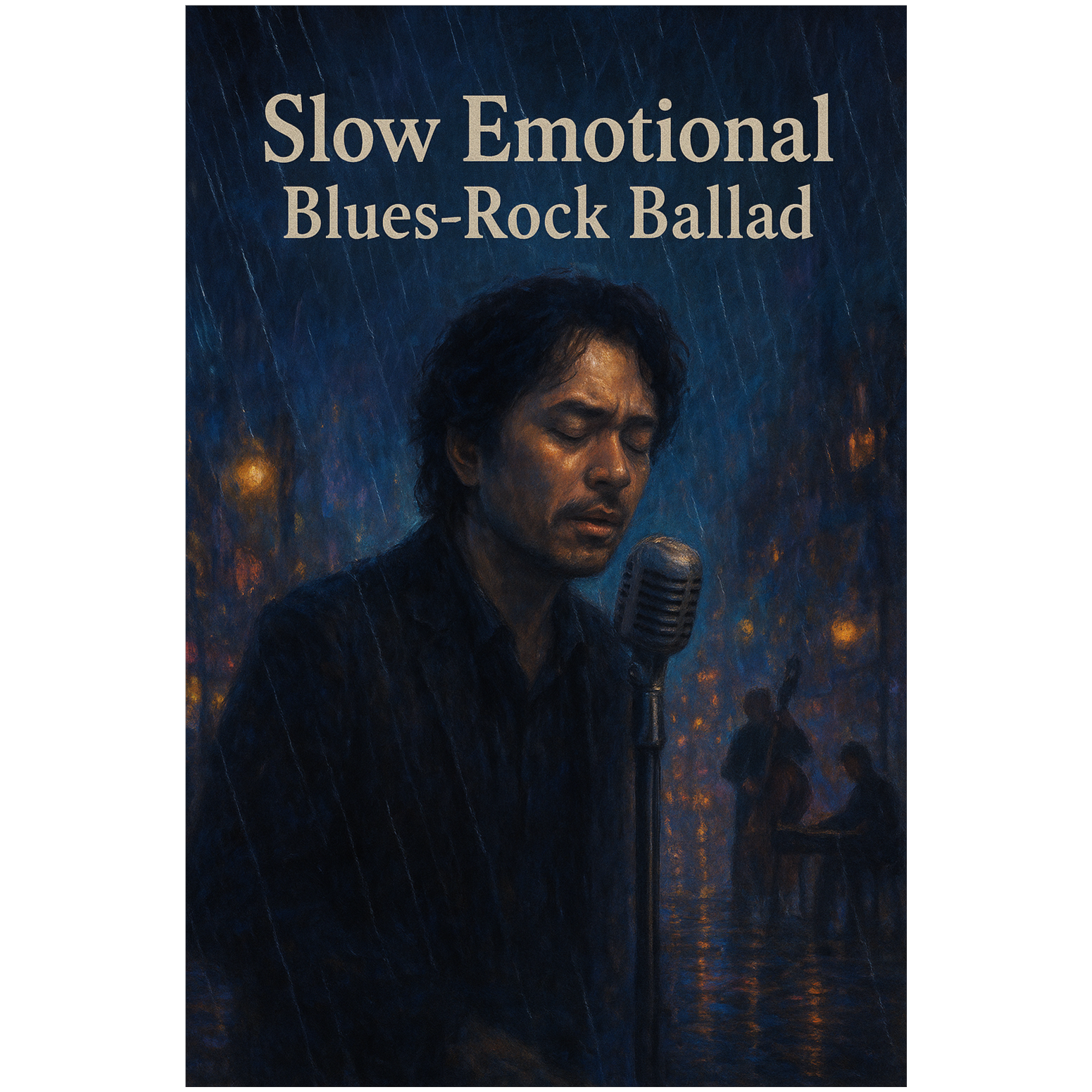 slow emotional blues-rock ballad, BPM 70, deep husky male vocal soaked in smoky reverb, fender rhodes electric piano shimmering in rainlike arpeggios, hammond organ pad breathing beneath, electric guitar bends and cries through wide tremolo and slow vibrato, upright bass softly walking with subtle slides, brushed drums in lazy shuffle embracing night ambience, light string section glowing like reflected neon in puddles, subtle female background whispers dissolving in echo, intro chord progression Em7–A7–Dmaj7–Gmaj7–F#m7–B7–Em7–A7, the entire soundscape blooming with cinematic sorrow and lingering warmth as if every raindrop remembers love once lost