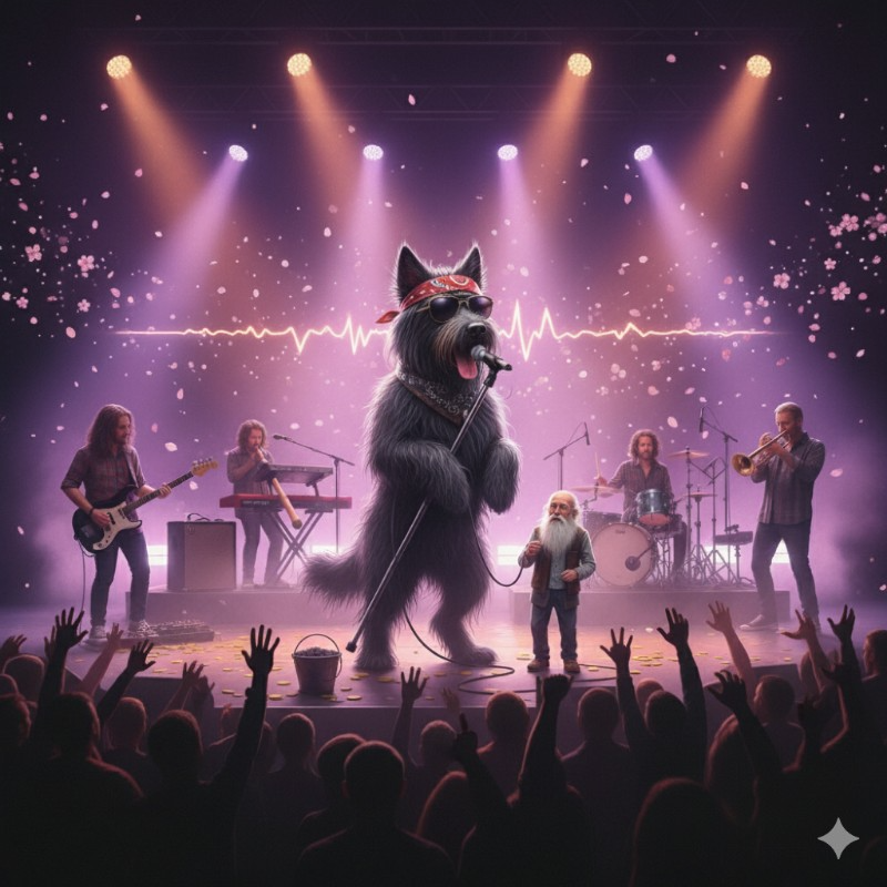 Live concert, Minor swing, funk rock, ultra-low growl bass vocals, live shouted chorus, didgeridoo, electric guitar, electric bass, synthesizer, trumpet, synthesizer scratch, drum machine, 168BPM, Deep swung groove with primal didgeridoo drone and funk bass syncopation, reflecting the dog's struggle to guide the old man, Sharply articulated wah-cut guitar stabs driving the rhythm, echoing a sharp “ワンワン” call, Dissonant trumpet and sarcastic synthesizer scratches emphasize the ironic lament, especially during the Chorus: "Let's make the cherry blossoms bloom, "Growl vocals should sound like the dog's booming, frustrated monologue, contrasting with the bright spoken intro, The Interlude's “bow wow” sections must be a powerful, aggressive funk call-and-response, Fading out with a low hum and sustained didgeridoo drone, with a final echoed “ワンワン, ”
