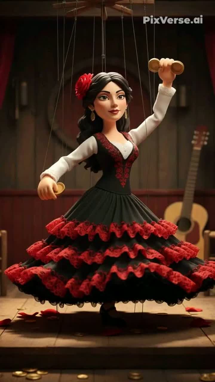 Gypsy flamenco rock, 138 BPM, sultry whispering female mezzo-soprano vocal, rapid-fire interweaving lines, percussive and arpeggiated textures with crisp hand-clap-like accents and rhythmic hand claps, instruments clashing and conversing energetically, fiery and sensual rhythm, vibrant festival energy, lyrics: "マリオネット", intense emotional flow reflecting entangled fate, passionate and seductive atmosphere, dynamic and expressive vocal phrasing