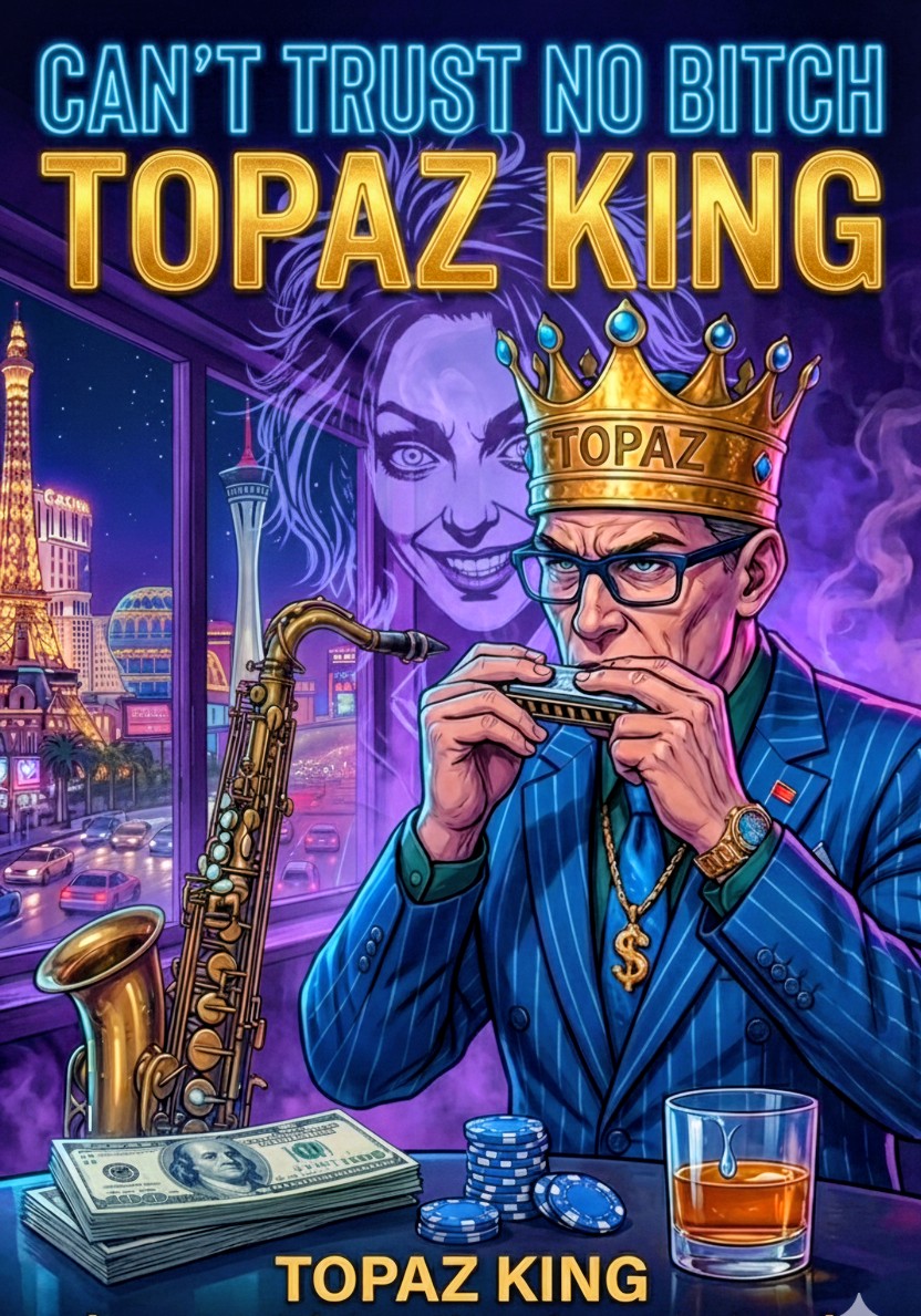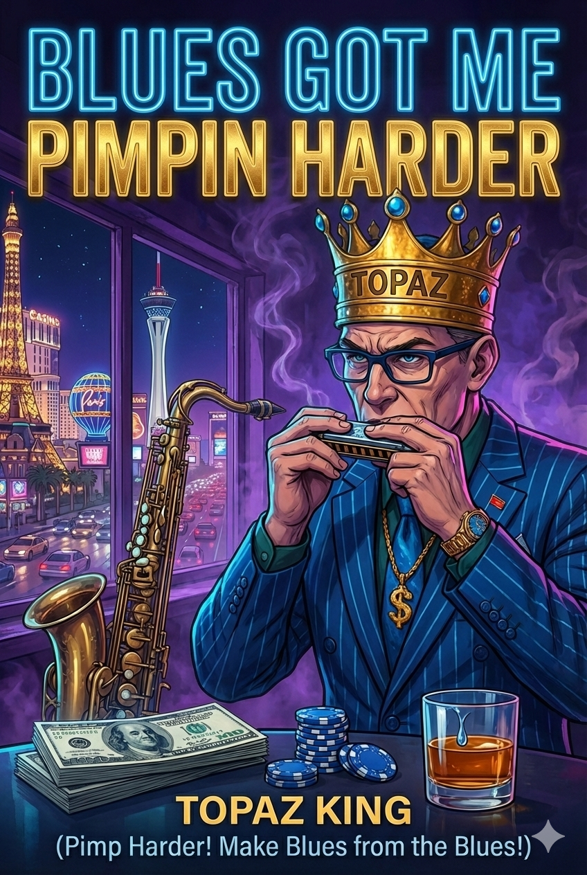 [West Coast G-Funk, slow heavy bounce, 84–88 BPM, E minor] Pimp rap fused with deep blues: wailing harmonica, crying saxophone hooks, thick 808 bass, crisp snares, bluesy guitar bends, dark Rhodes chords, Topaz King persona: smooth drawl, offbeat slick flow, humorous but cold pimp wisdom, Theme: “the blues got me pimpin harder, the blues got me making blues, ” Structure: Intro, Verse1, Hook, Verse2, Sax/Harmonica solo, Hook x2, Blues breakdown bridge, Outro, Mood: neon-lit streets, heartbreak, money focus, turning pain into hustle